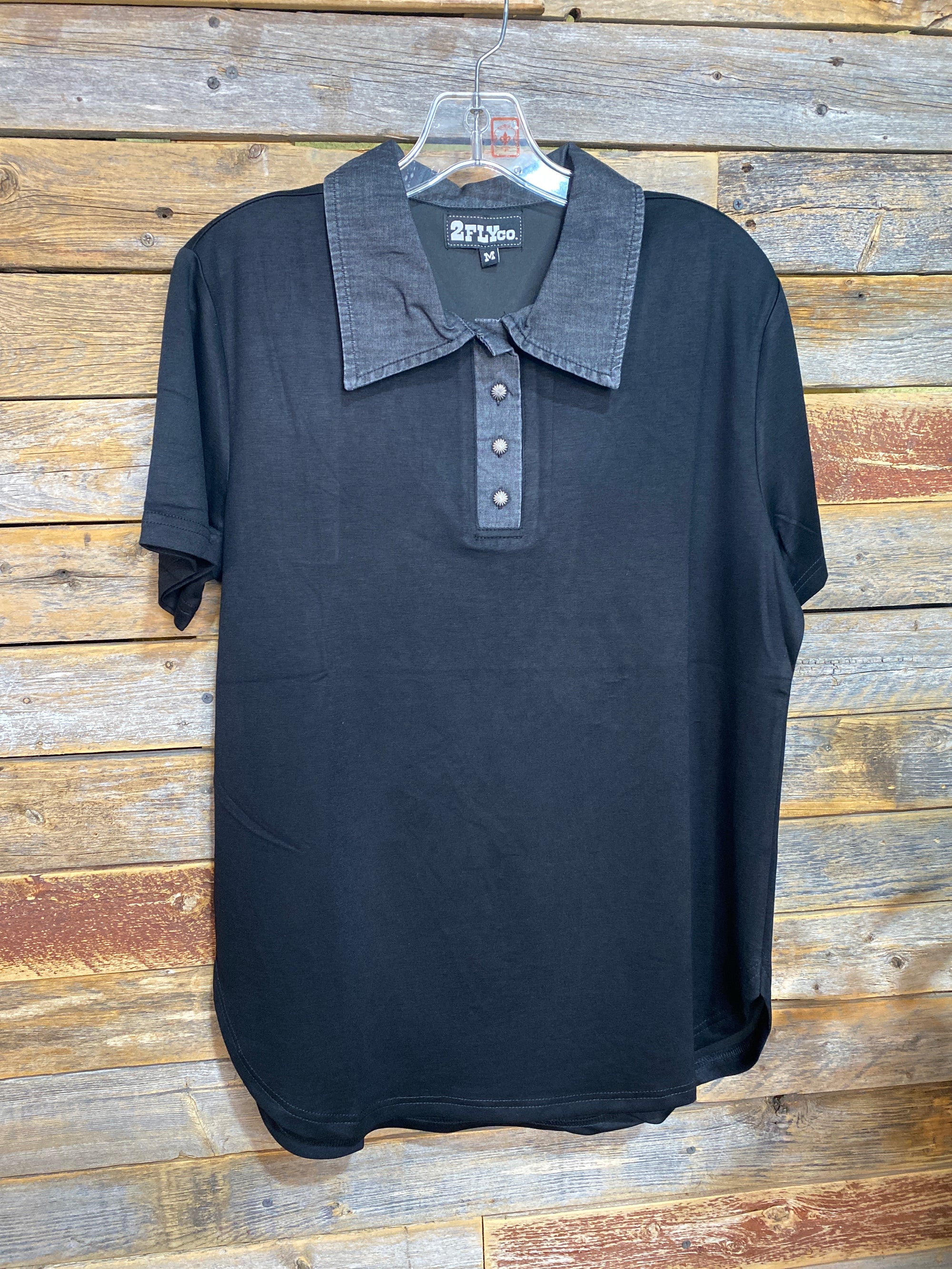 The Brockton Top combines comfort and style with its stretch knit fabric made of 95% rayon and 5% spandex for a flattering fit. Available in tan with a denim collar or black with a washed black collar, each features a silver concho button detail that adds a distinctive touch. Easy to care for, this top is machine washable on a gentle cycle and dries quickly on low heat, making it perfect for everyday wear with a polished edge.