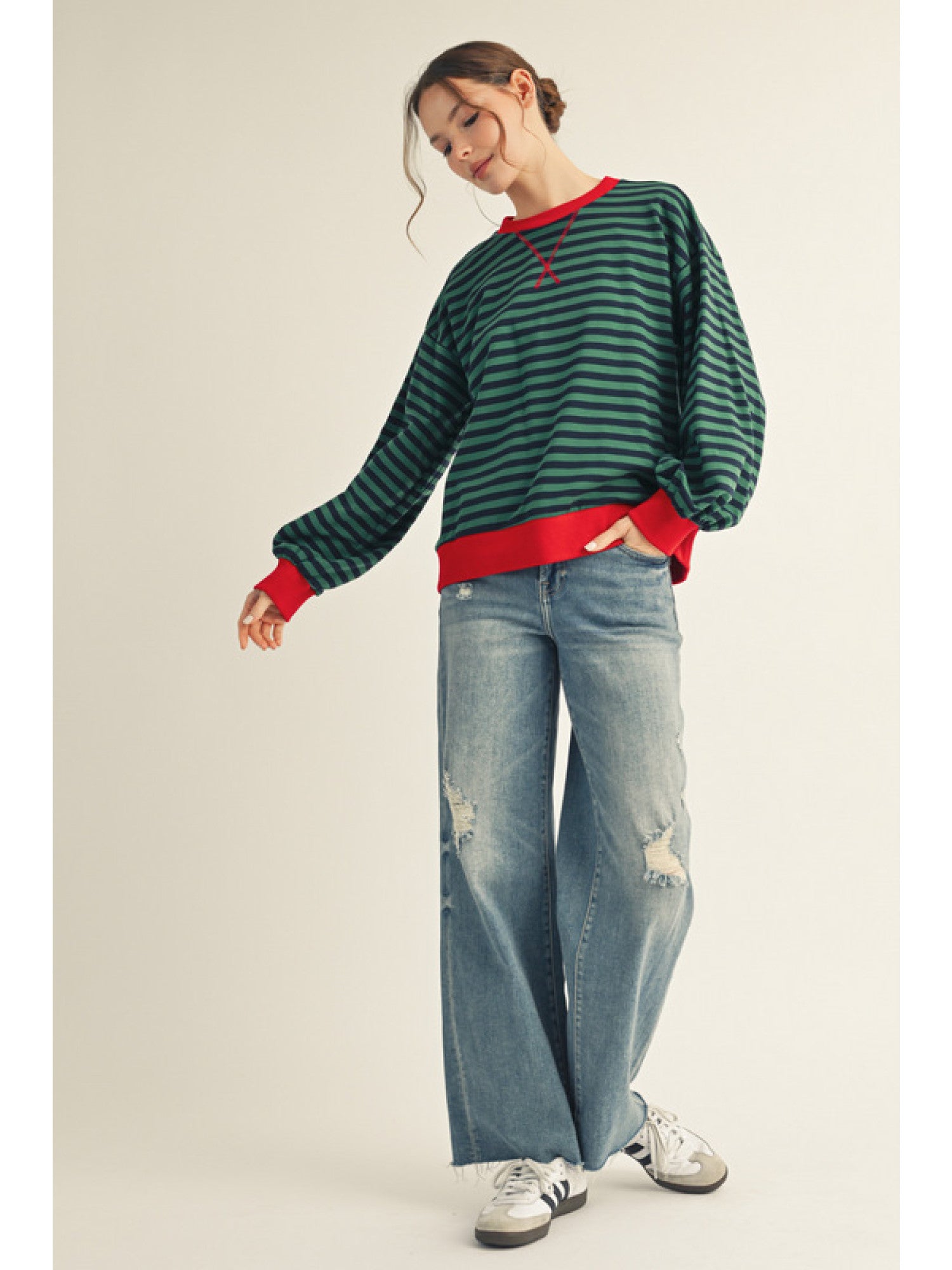 Cozy up in this Hunter Navy Striped Pullover featuring long puff sleeves and a playful v-notched neckline. The solid contrast binding adds a cute twist, while the soft cotton-spandex blend keeps you comfy all day. Perfect for holiday vibes without shouting it—just stylish, subtle cheer!