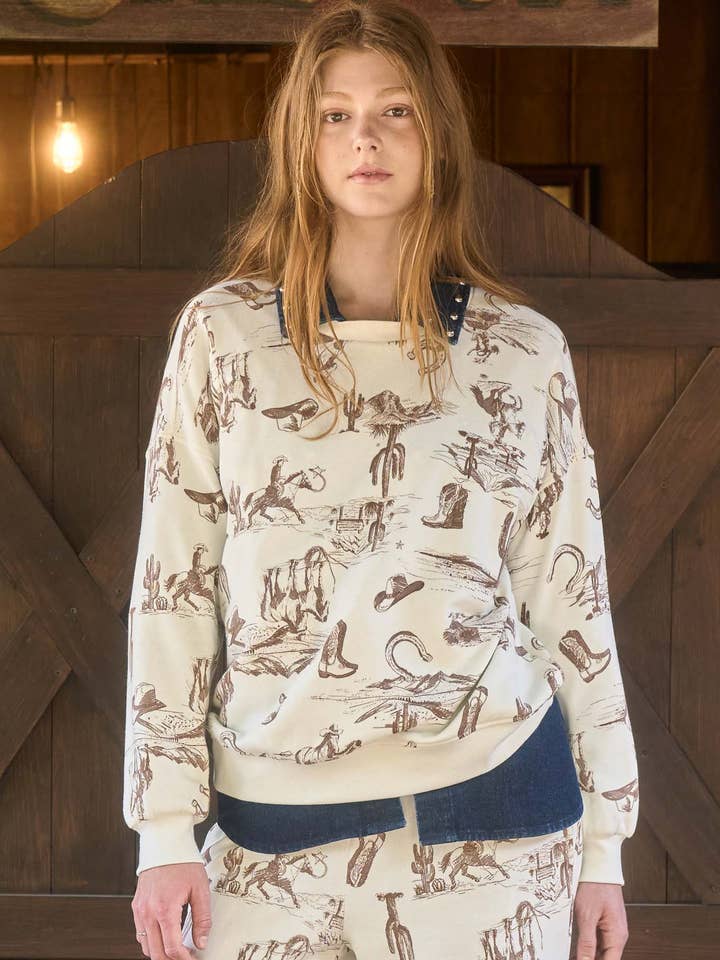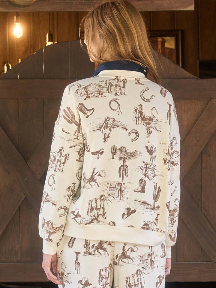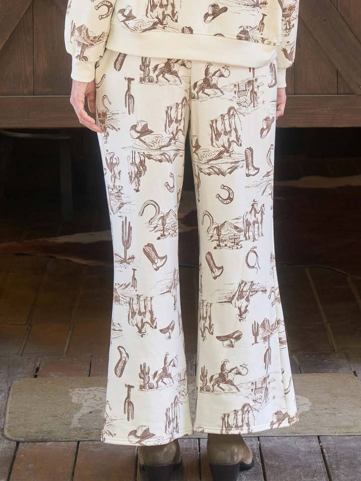 Experience ultimate comfort and style with the Cream Western Print Top & Bottoms set. The top features a relaxed fit, crew neckline, and drop shoulder detail for a cozy, casual look. Made from a soft cotton-polyester blend, it ensures breathability and ease. The matching jogger pants offer a high waist with elastic and pockets, along with a straight leg silhouette for everyday comfort. The unique Western print adds a fashionable touch, perfect for lounging or casual outings. Together, this set combines comfort and trend effortlessly.