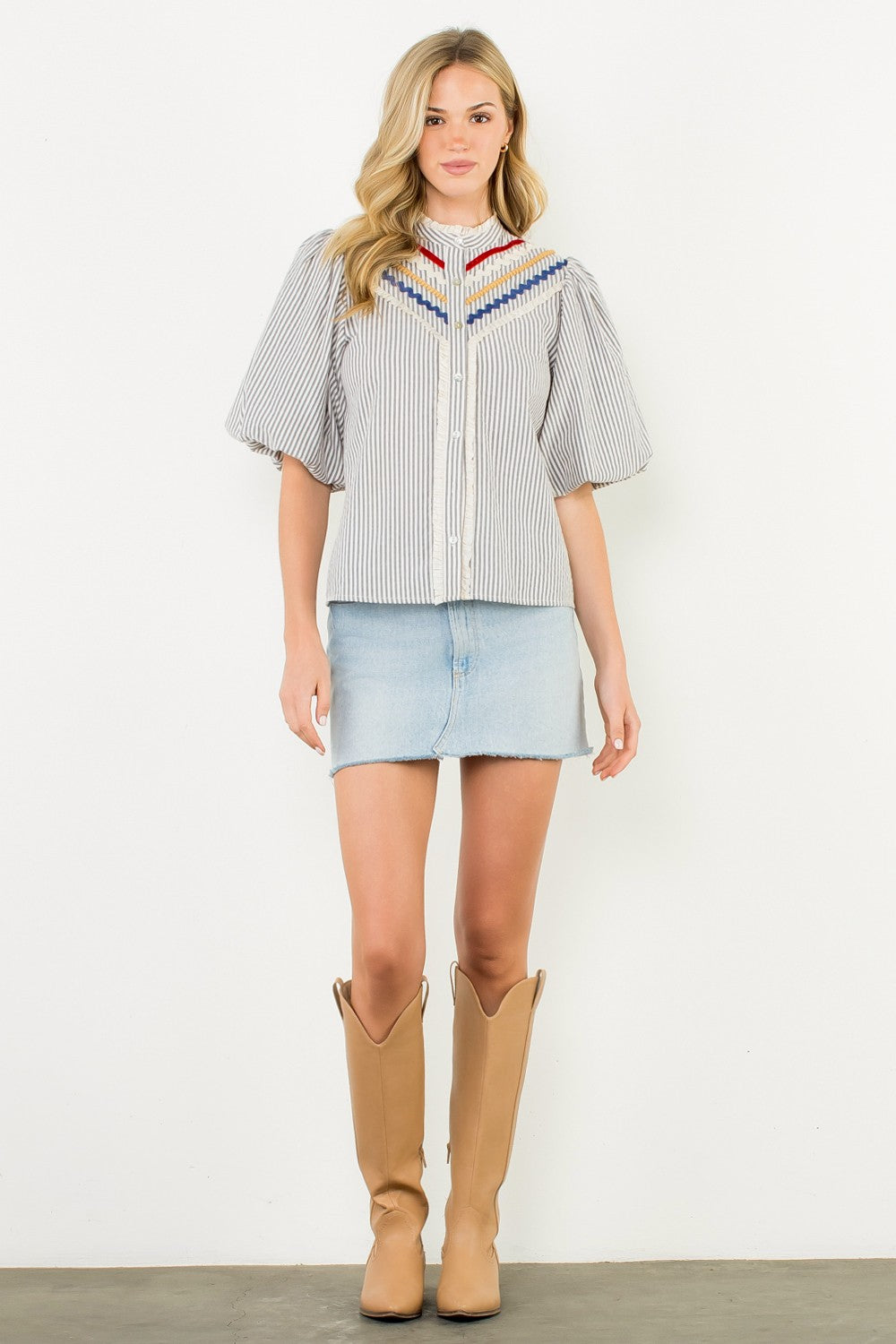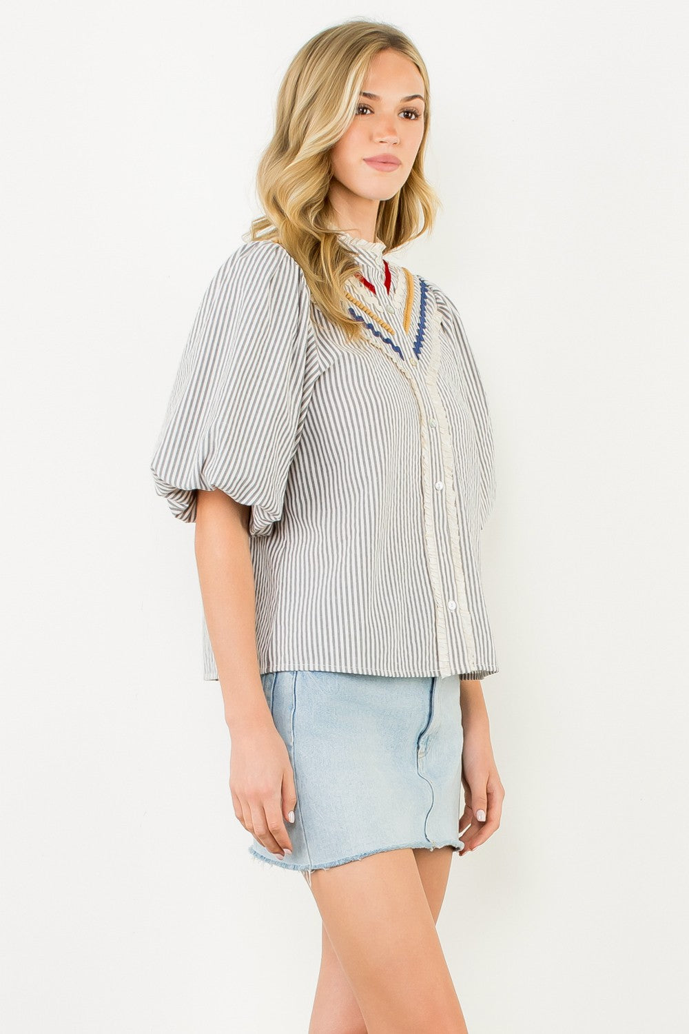 Crafted with a blend of 70% cotton and 30% polyester, the Striped Puff Sleeve Trim Top offers a comfortable woven fabric that balances softness and durability. Designed in the USA, this top features a body length of 23 5/8 inches and a bust width of 39 inches in size S, ensuring a flattering fit with its puff sleeve detail measuring 12 1/2 inches. Modeled on a 5'9" frame wearing size S, it delivers a tailored yet stylish silhouette ideal for versatile wear.
