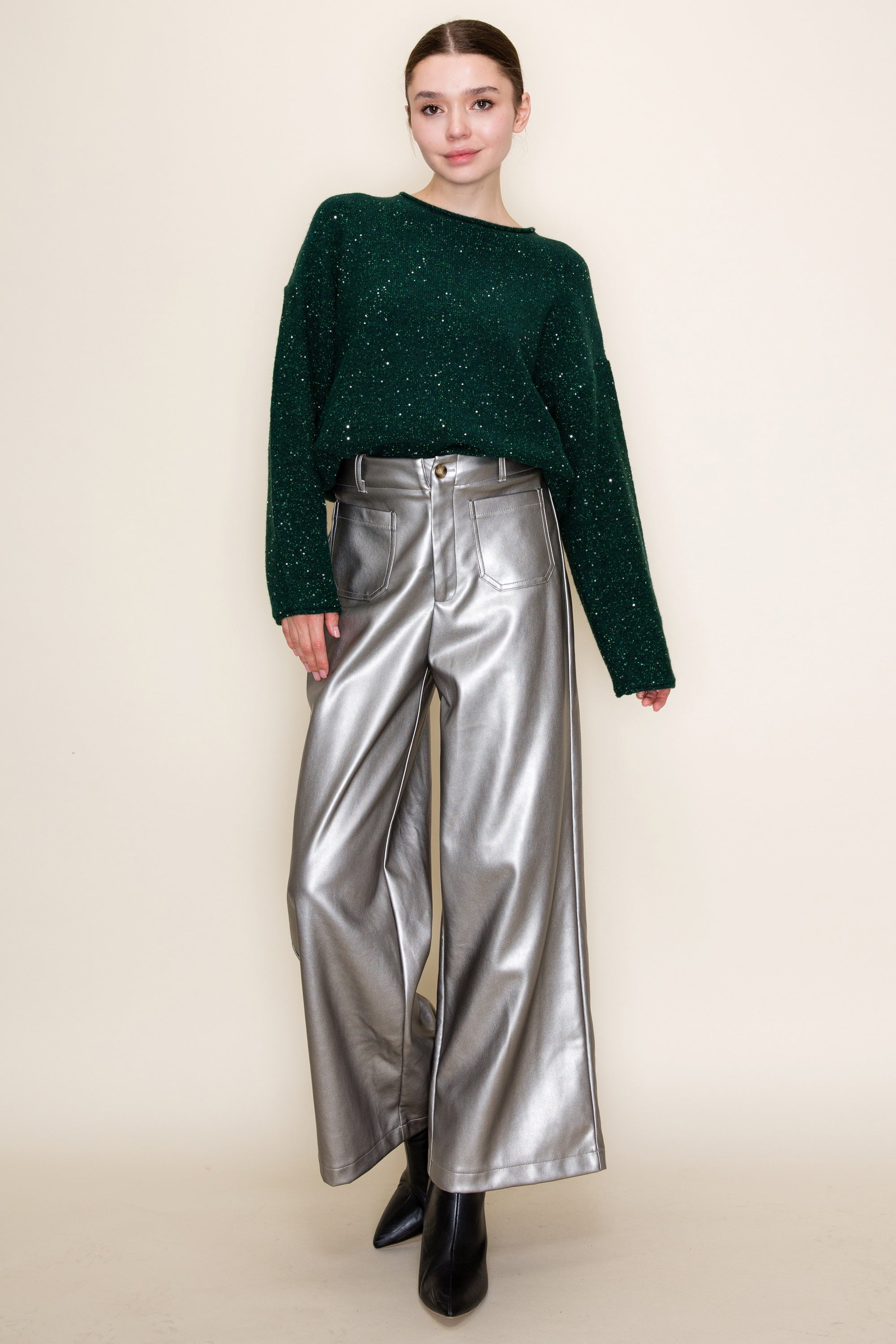 These Metallic Grey Wide Leg Pants combine bold metallic shine with a flattering high waist cut for a confident fit. Crafted from faux leather, they feature convenient front patch pockets and a secure button-zip closure, blending style and practicality effortlessly. Perfect for adding an edgy, polished touch to your wardrobe while ensuring comfort throughout the day