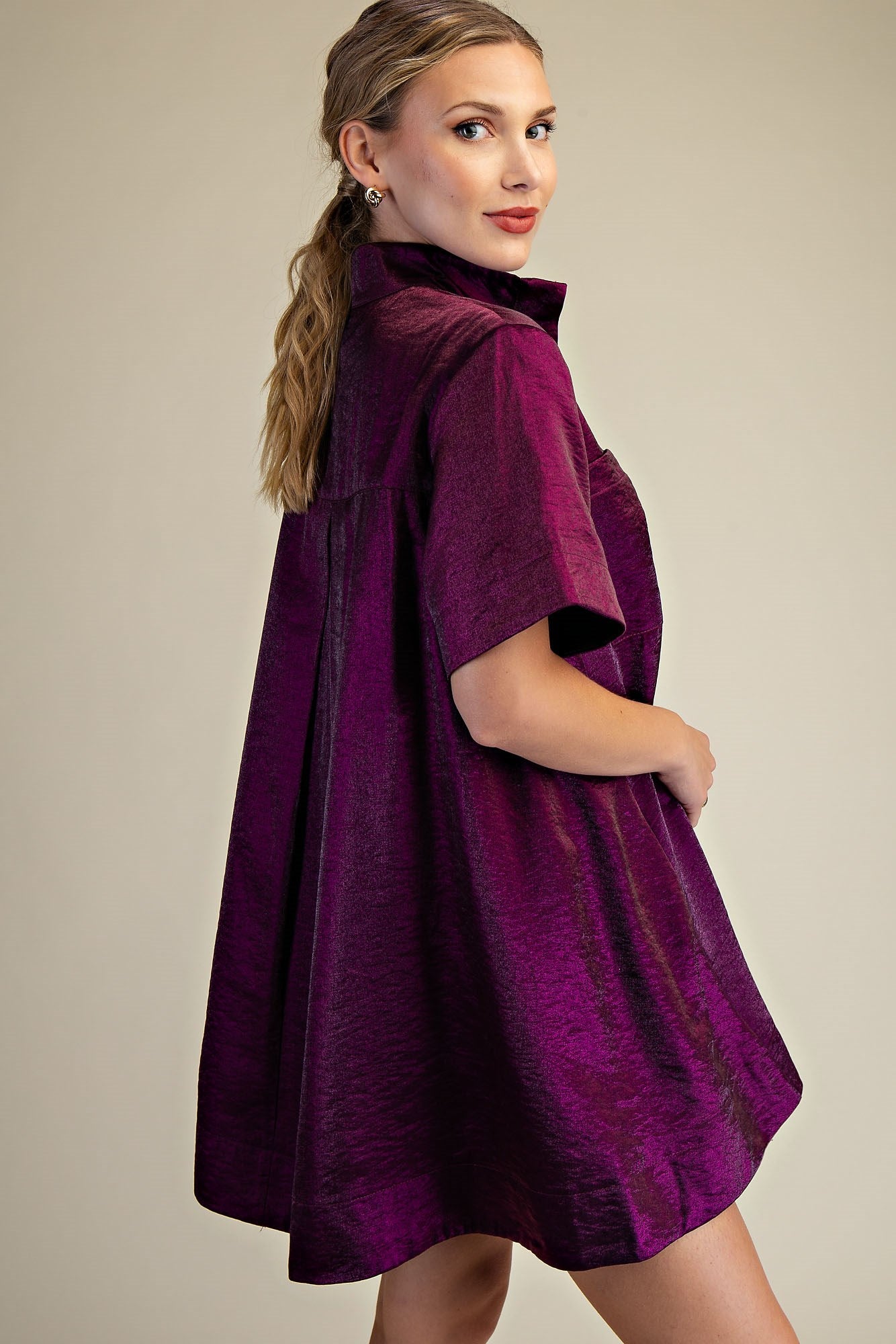 The Donna Button Front Short-Sleeve Mini Dress is available in elegant brown or rich plum hues, crafted from a textured shimmer fabric that evokes a refined holiday allure. Made from a soft and breathable blend of 50% rayon and 50% cotton, this dress combines comfort with sophistication, making it an exceptional choice for festive events or polished daytime wear.
