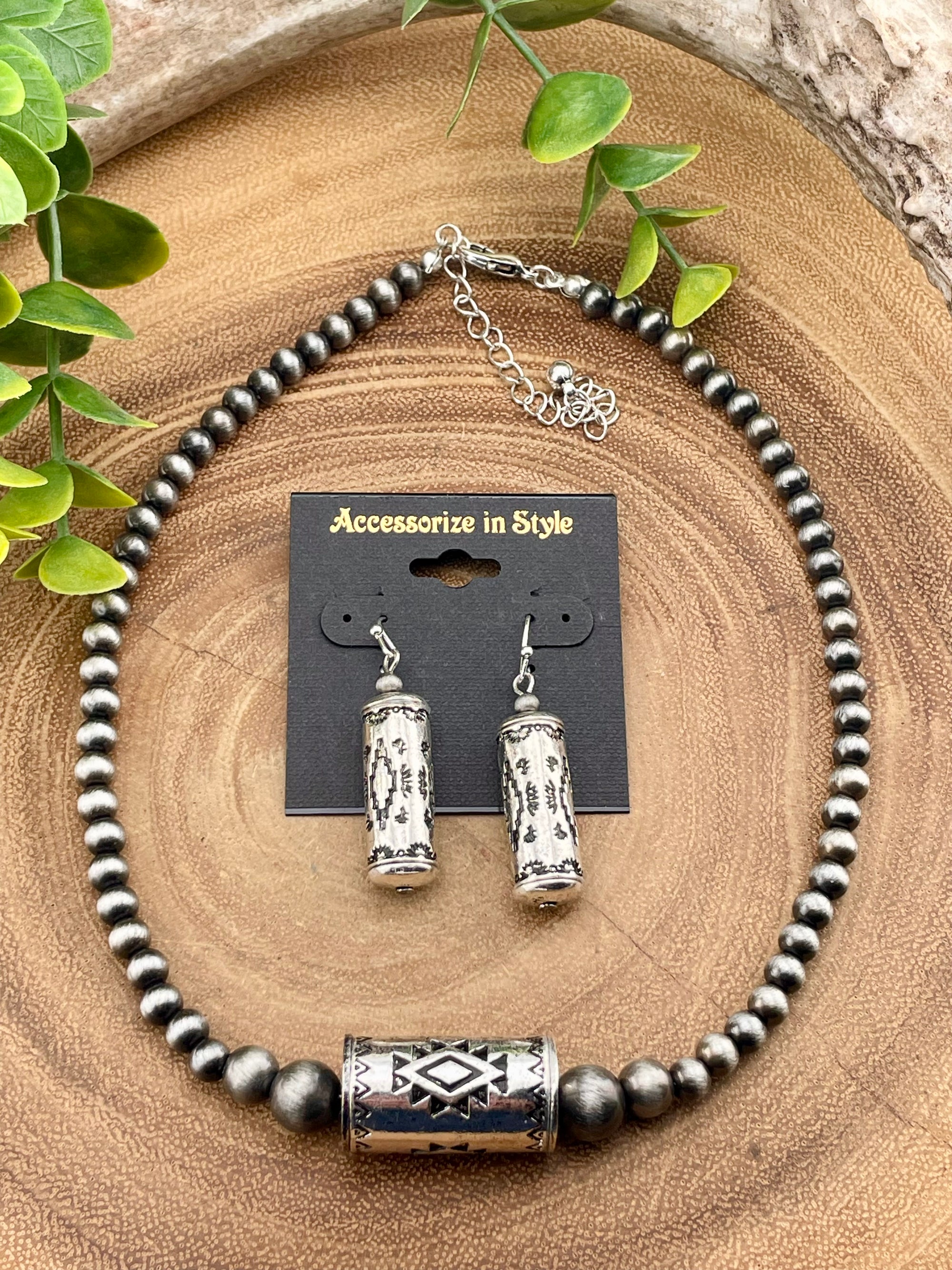 Panem Fashion Silver Pearl Necklace With Center Stamped Barrel Bead - 18"