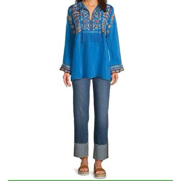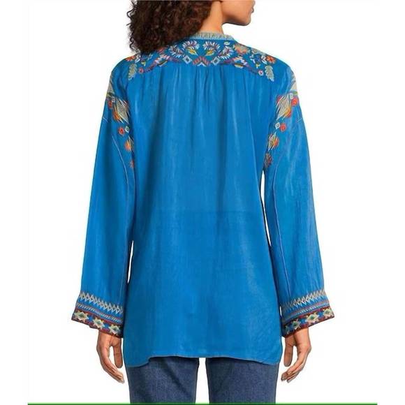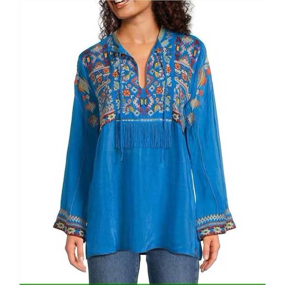 This stunning tunic from Johnny Was boasts intricate embroidered detailing and a flattering V-neckline with drawstring ties. The long sleeves and soft 100% rayon fabric make it a comfortable choice for any occasion. Hand wash recommended. Imported