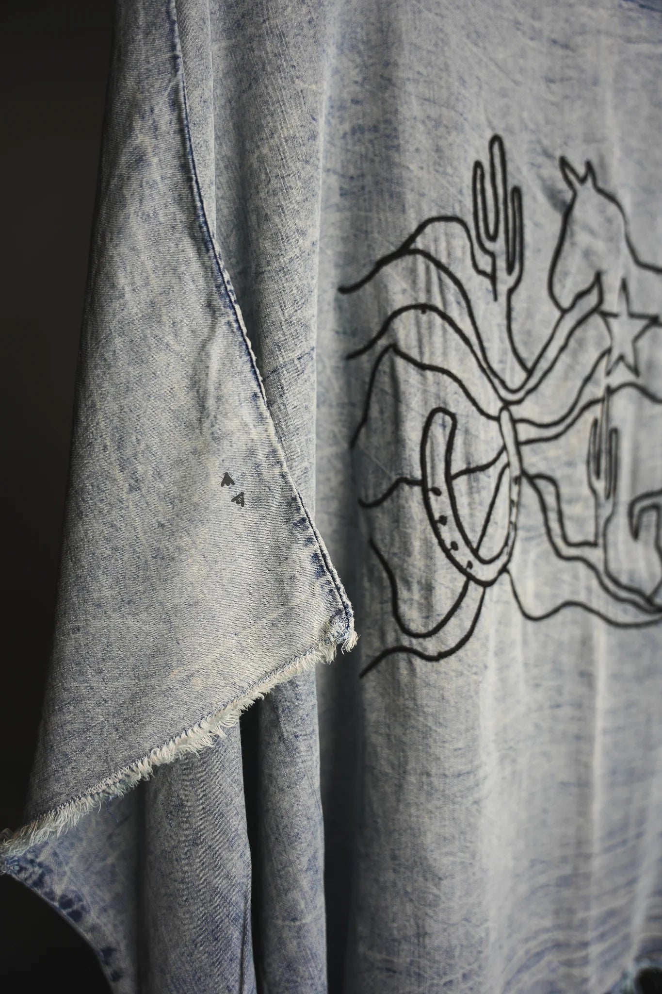 Introducing the Head Honcho Poncho, your all-time favorite denim chambray poncho with a wavy western pattern, light denim effect, embroidery, and raw hem. Made with 55% cotton and 45% tencel for ultimate comfort and style. Upgrade your wardrobe with this must-have piece!