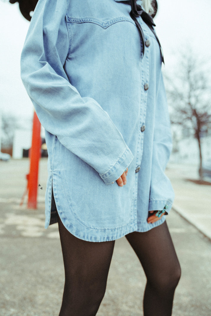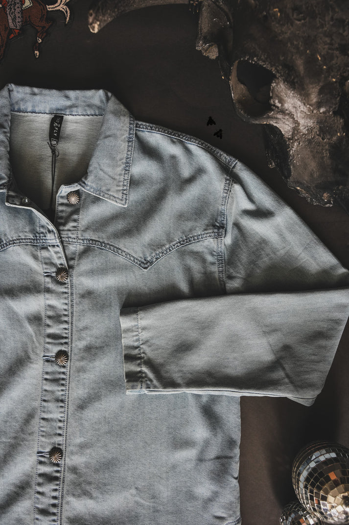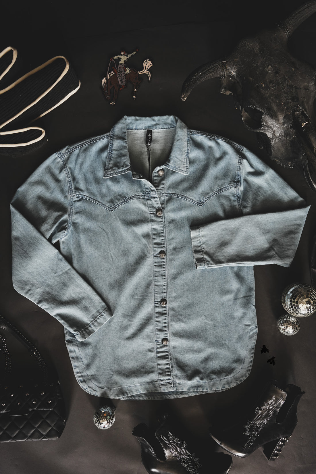 Experience the fan-favorite Homesteader Top at the market. This oversized denim shirt features custom buttons and can be worn as a button-up or paired with a graphic underneath. Made of 100% cotton, it offers an oversized fit, though you can size down for a more fitted look.