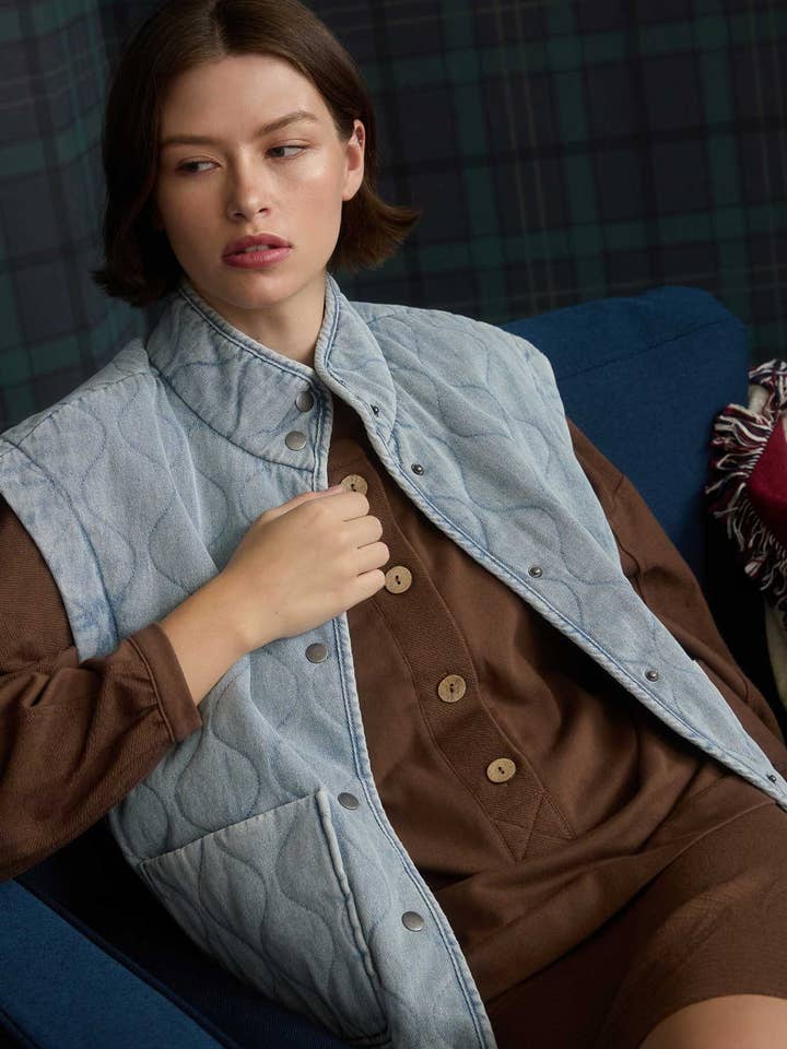 This sleeveless Quilted Denim Vest features a relaxed, oversized fit with a drop shoulder design for easy layering. The acid-washed cotton shell has a unique quilted pattern, with tones that may vary for a one-of-a-kind look. Finished with a mock neckline, button-down front, and handy pockets, this vest is fully lined with polyester for extra comfort and warmth. Perfect for adding style and insulation to your outfit without bulk.