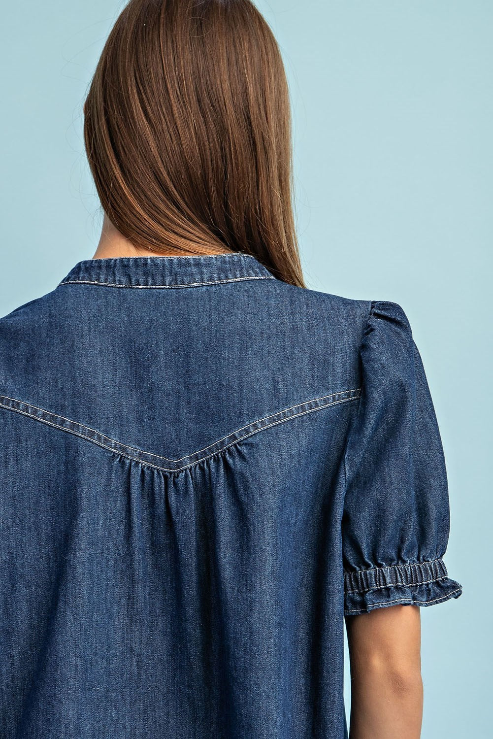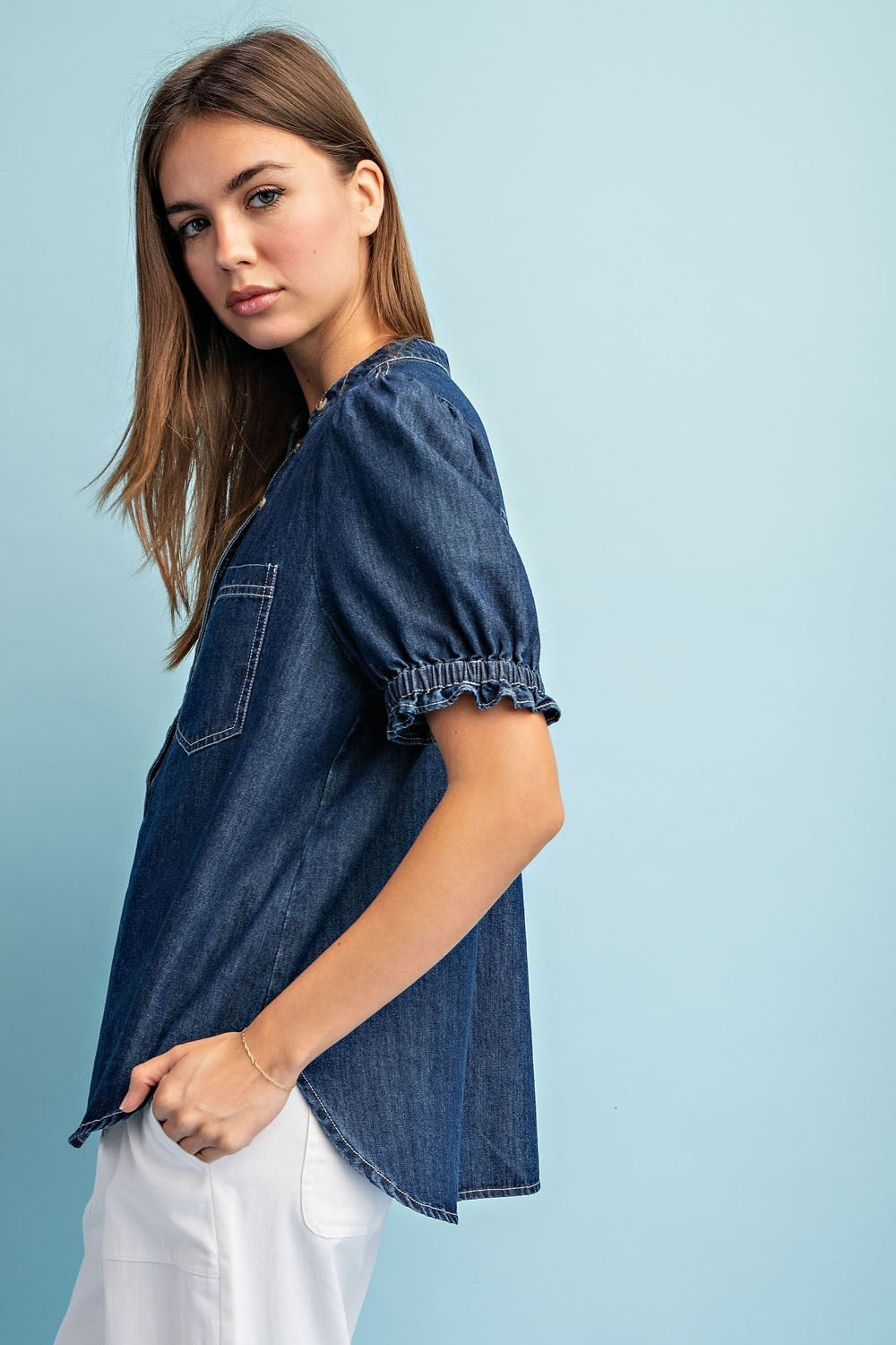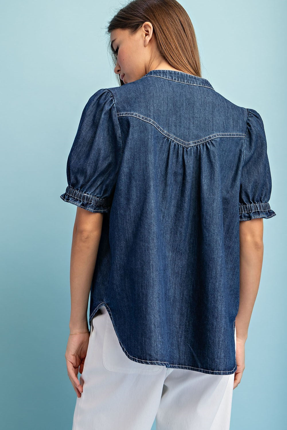 Mineral washed short sleeve denim top featuring a notched neckline, a half button down front, one chest pocket, pinched shoulders, elastic cuffs, added pinching in the back and has a rounded bottom hem.