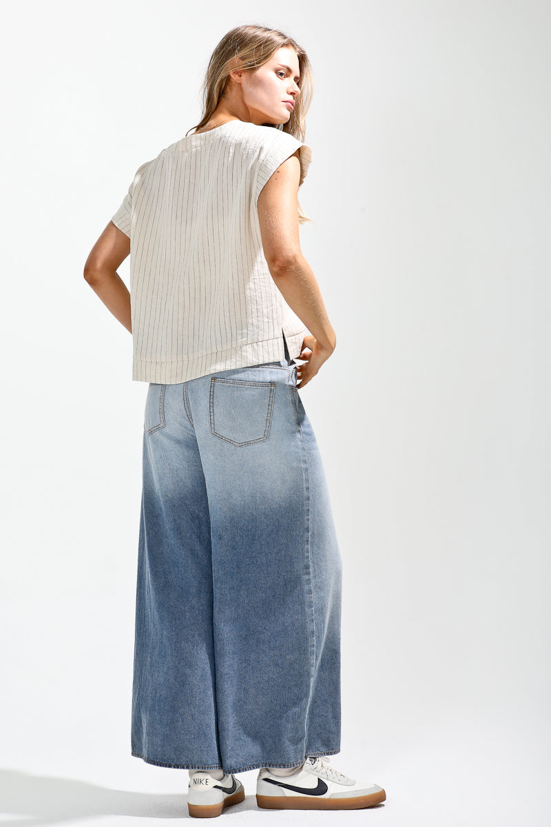 These wide denim pants feature a loose, vintage-inspired fit with an ombre dye effect and come with a waist strap for added style and adjustability. Made from 100% cotton denim, they offer comfort and breathability.