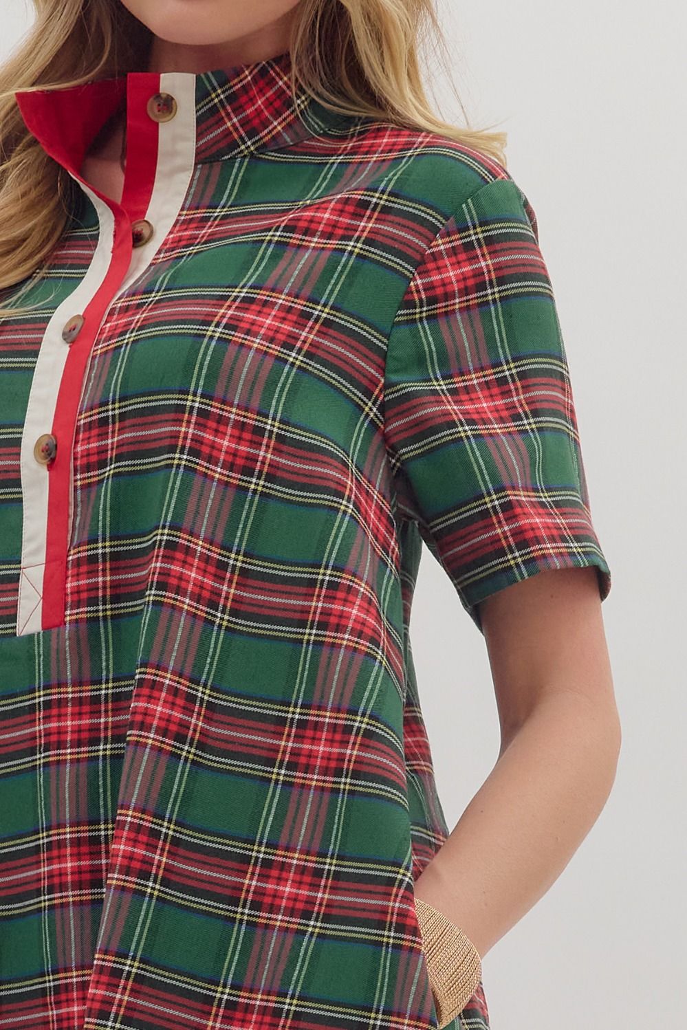 Step out in playful charm with this plaid short sleeve mini dress. Featuring a contrasting buttoned placket and collar lining, it adds a fun twist to a classic look. Lightweight and woven from a comfortable polyester-cotton blend, it’s fully lined and non-sheer for effortless wear. Practical side pockets keep essentials handy, while the vibrant red and green colors brighten up any day. Perfect for twirling through sunny afternoons or casual nights out.