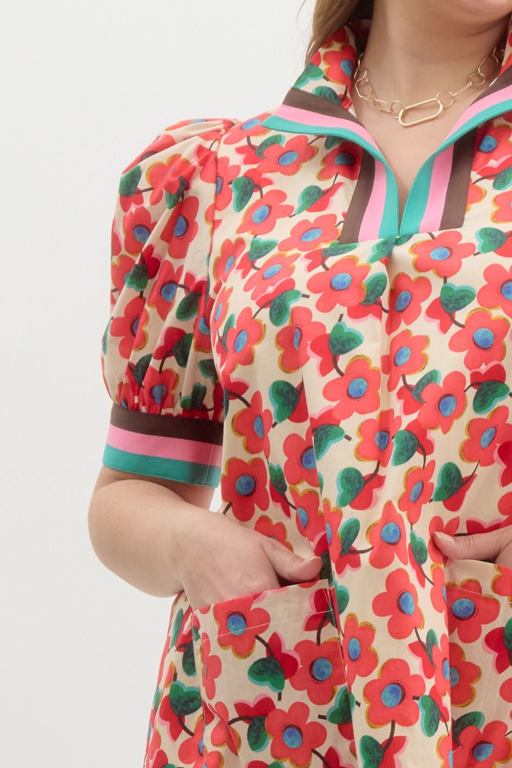 Experience the beauty of spring with the Mindy Floral Dress. This mini dress features a breathtaking floral print, puff sleeves, and a multicolor band at the split neck and sleeves. With patch pockets and a lightweight, non-sheer woven material, this dress is both practical and stylish. Stay on trend and stand out in this lined dress that is sure to turn heads.