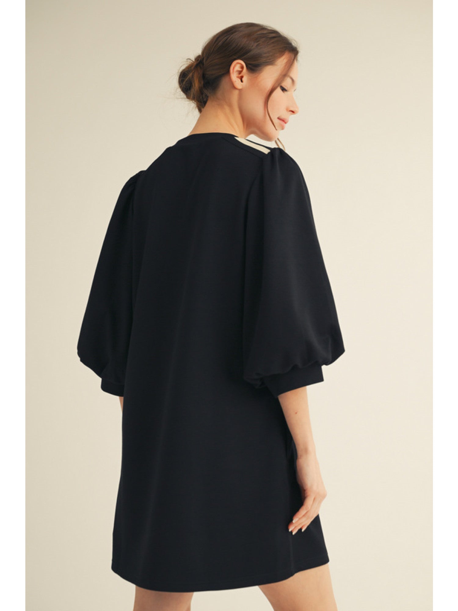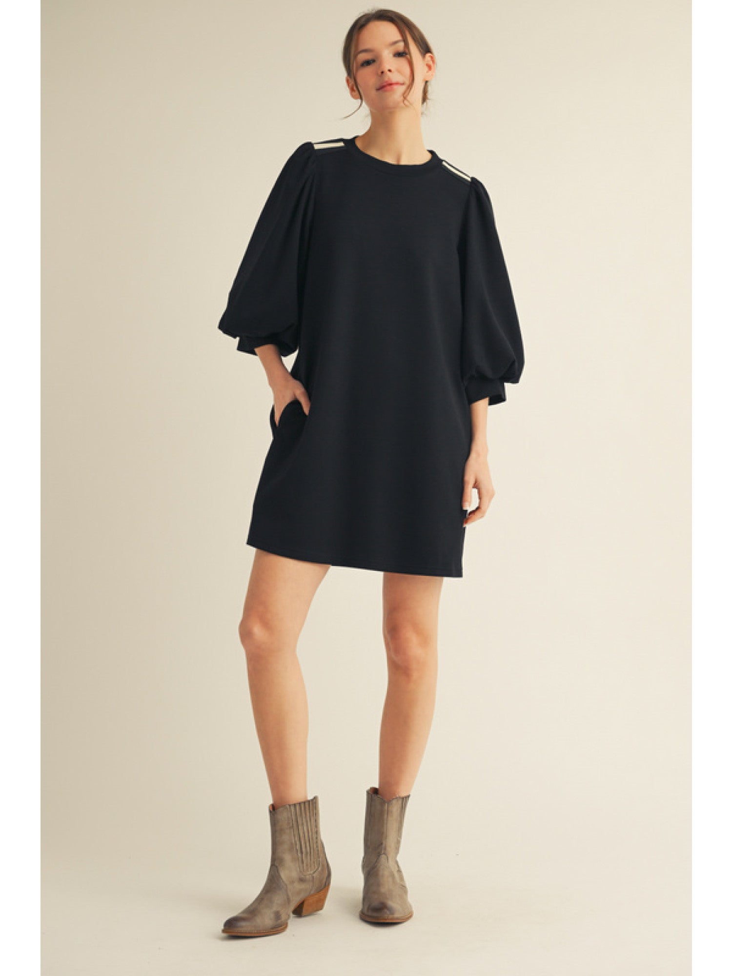This black casual dress features bold 3/4 puff sleeves and a distinctive stripe trim accent on the shoulders, injecting a daring edge into everyday style. Crafted from a comfortable blend of rayon, polyester, and spandex, it offers a flattering stretch fit. Practical side pockets add functionality without sacrificing flair, making it the perfect choice for confident, effortless wear.