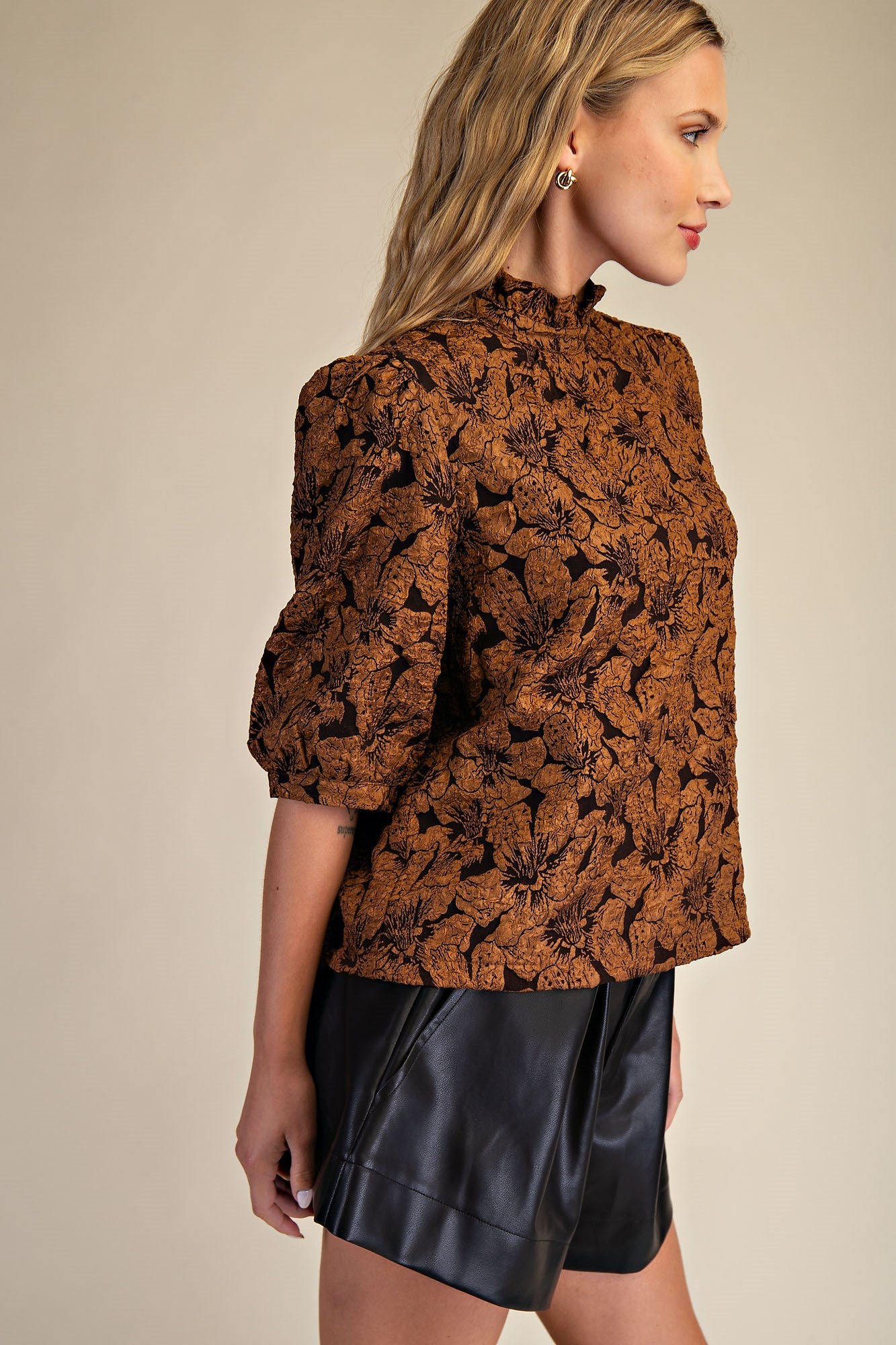 Crafted from a textured fabric in rich brown with subtle black undertones, this Brown High Collar Balloon Sleeves Top combines elegance with comfort. Made from 97% polyester and 3% spandex, it offers a refined fit with gentle stretch. The high collar and softly voluminous balloon sleeves add a sophisticated touch, perfect for elevating any polished look.