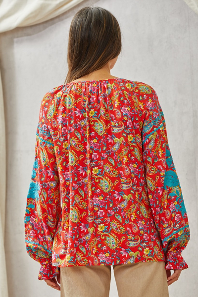 Elevate your spring and summer wardrobe with our Hazel Long Sleeve Tunic Top. Crafted from 100% Rayon in a stunning paisley print, this loose-fitting top features intricate embroidery throughout the bodice, adding a touch of elegance to any look. Stay stylish and comfortable all season long.