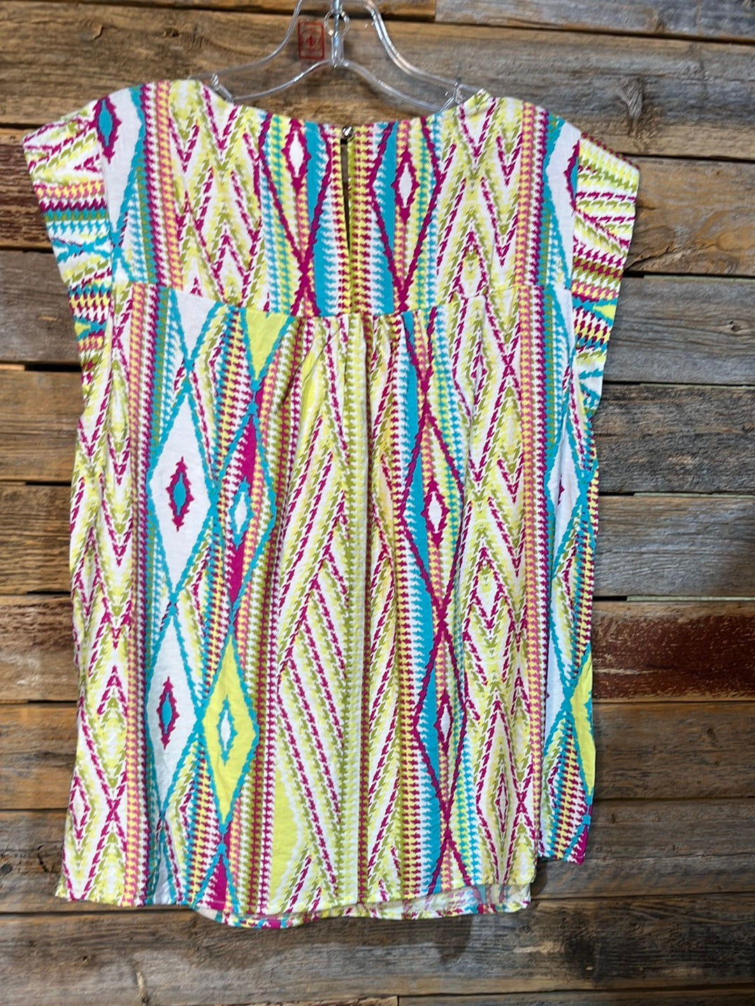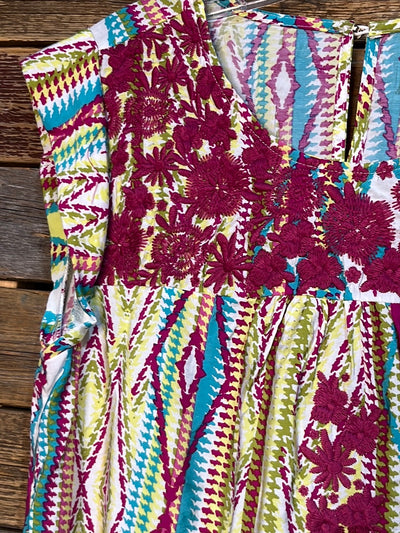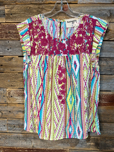 Add a pop of color to your wardrobe with our Magenta Embroidered Aztec Printed Blouse. This tunic top is perfect for any occasion, boasting a unique aztec print and beautiful floral embroidery. With cap sleeves and a comfortable 83% rayon and 17% nylon blend, this blouse is both stylish and comfortable.
