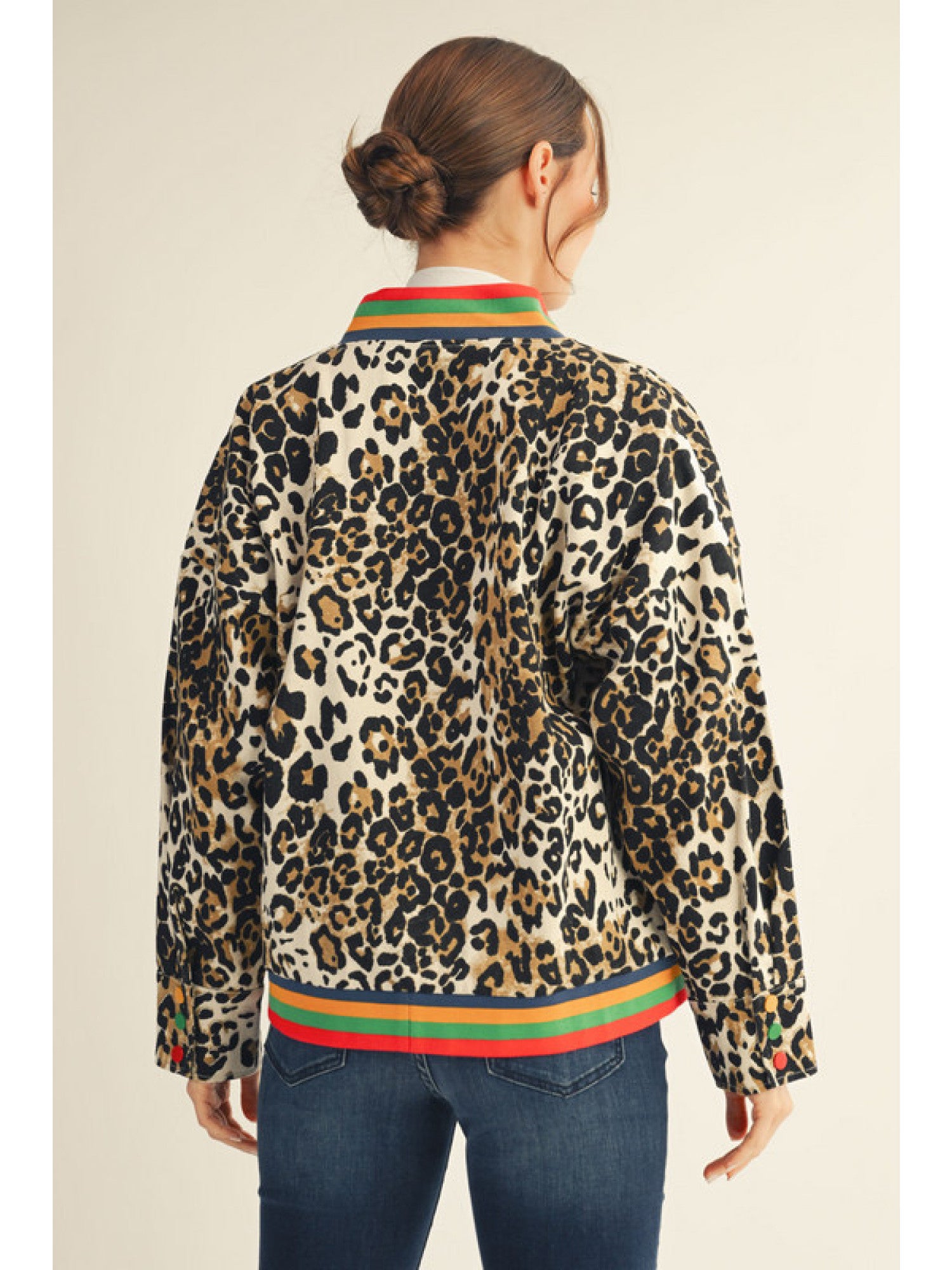 Elevate your wardrobe with this Leopard Bomber Jacket, featuring long sleeves and a front zip closure for easy wear. The color ribbed band neckline and hem add a cozy, stylish touch, while the three-colored buttons on the wrist cuffs provide unique detail. Made from 100% cotton, it ensures breathable comfort throughout the day. Designed to fit well and flatter, this jacket is perfect for adding a bold yet comfortable layer to your outfit. Modeled by someone 5'10" wearing a Small for reference.