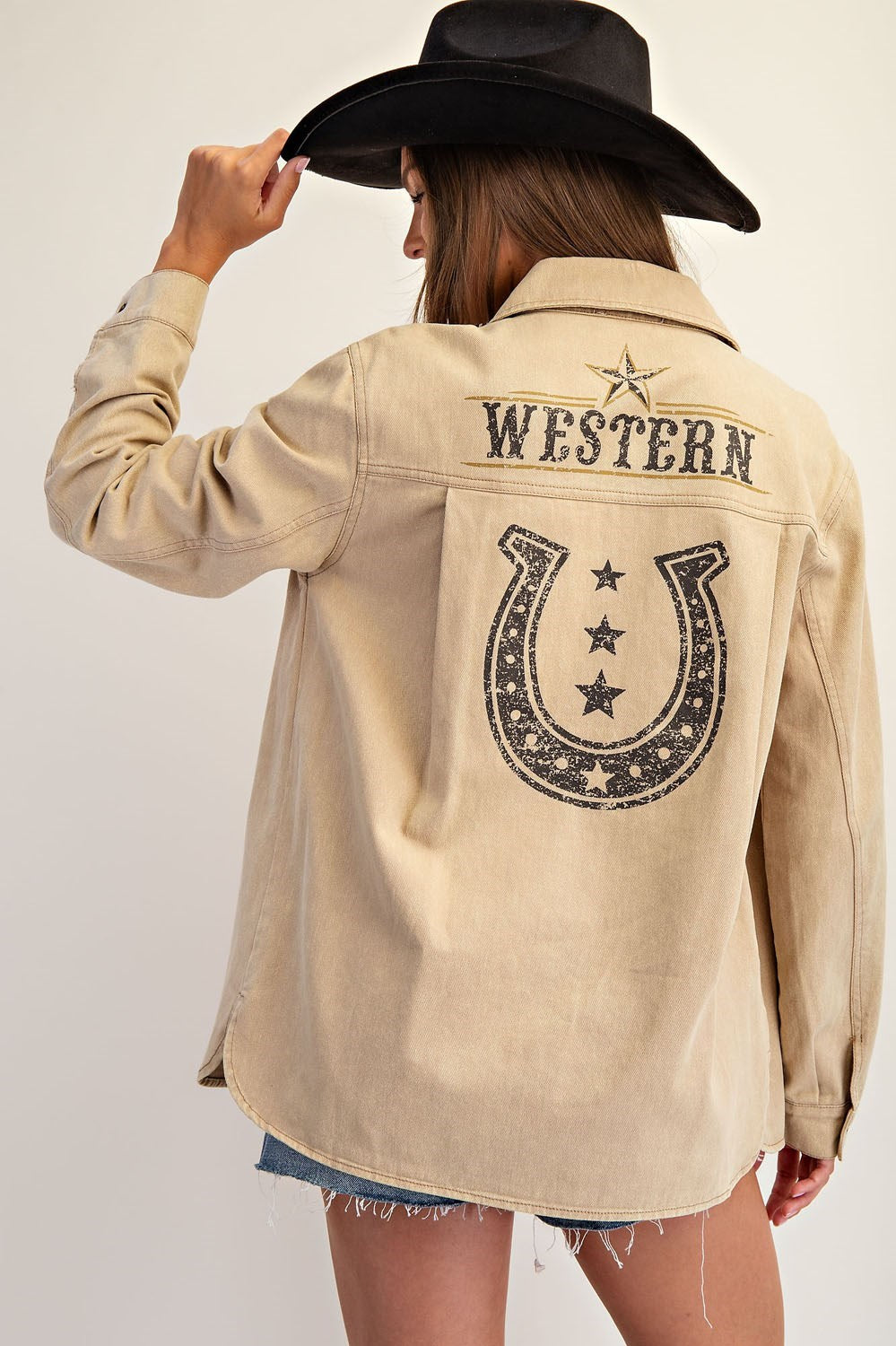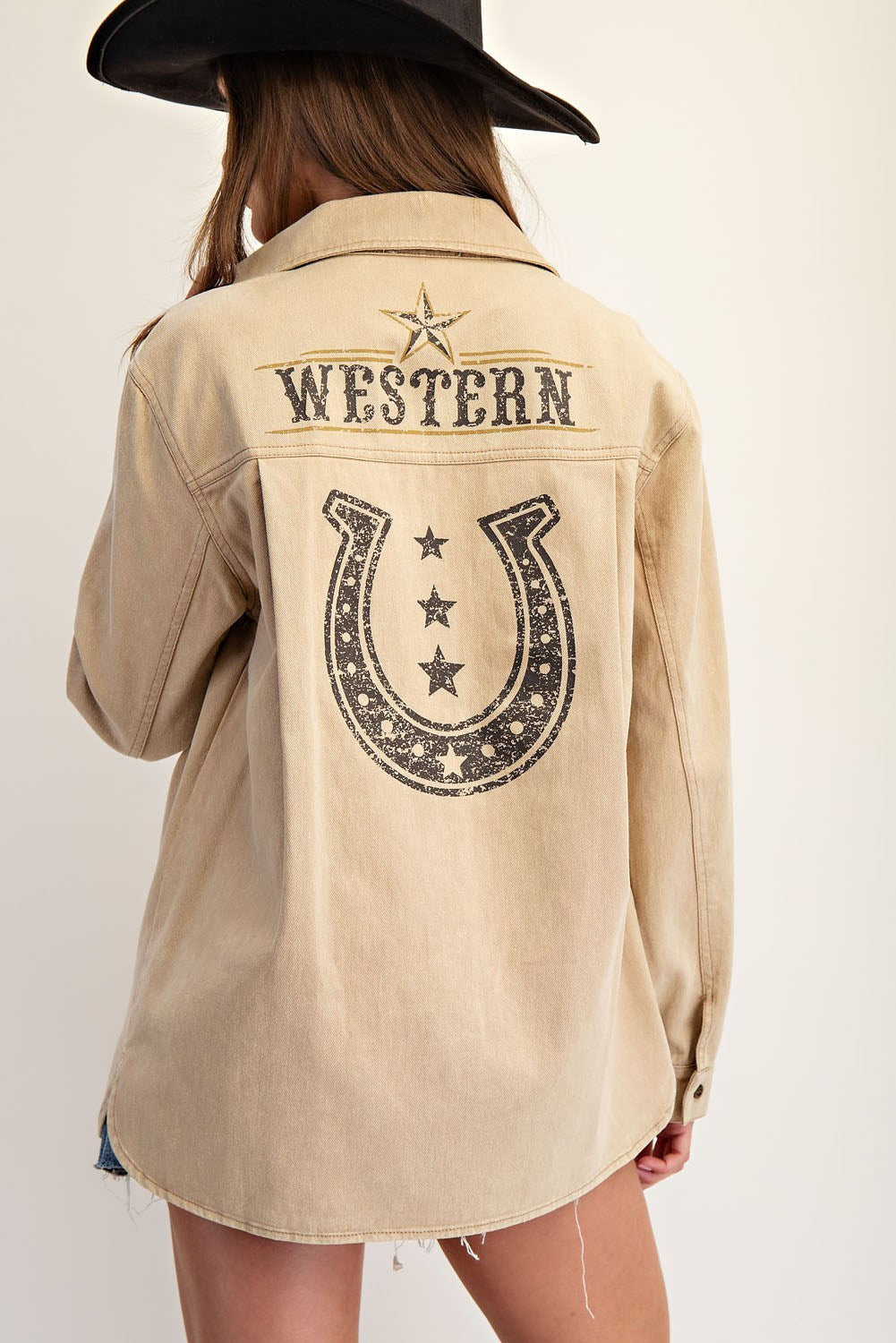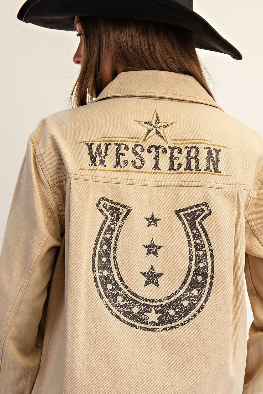 This Snow Washed Western Graphic Back Jacket combines rugged Western style with modern detailing. Crafted with an enzyme, stone, bleach, and snow wash treatment, it offers a unique worn-in texture. Features include a pointed collar, button front closure, buttoned cuffs, and a chest patch pocket for practicality. The standout bold back graphic showcases distressed "Western" typography, star accents, and a horseshoe motif, adding authentic character. Curved side slits and a relaxed hemline complete the design, ensuring a comfortable fit with a refined, expert touch.