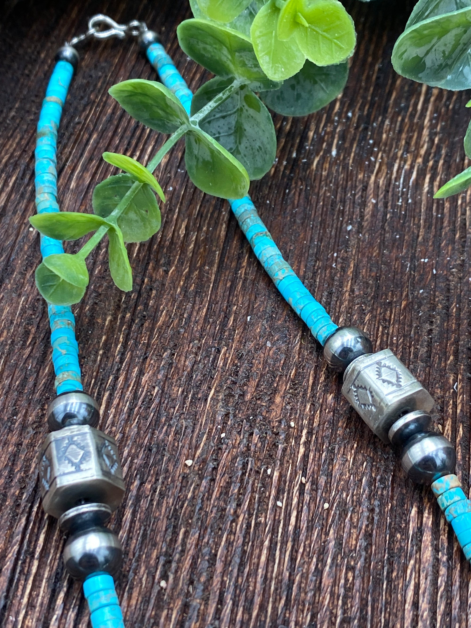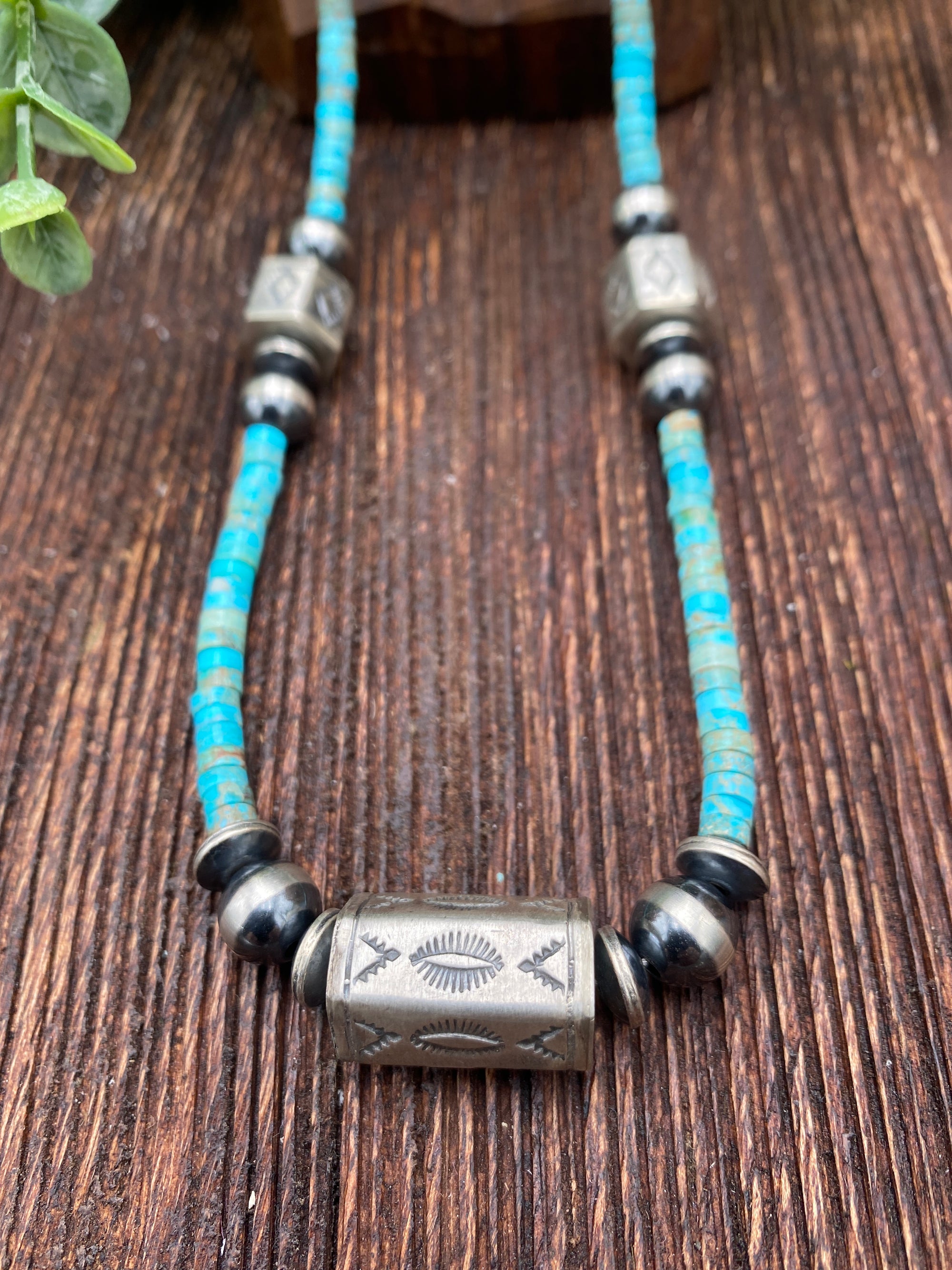 Rory Turquoise Heishi Necklace With Pearls, Saucers & Stamped Hex Beads - 18"