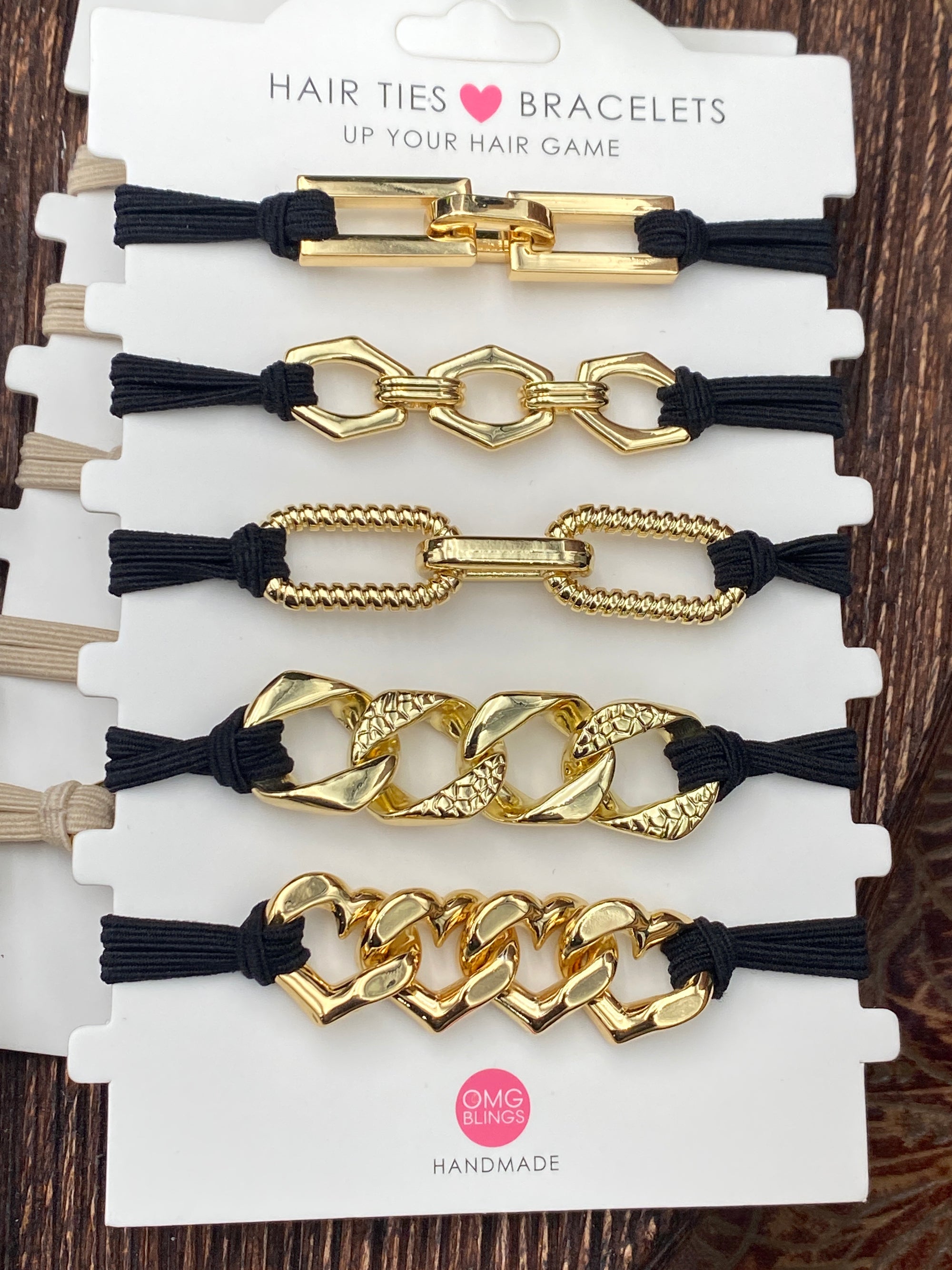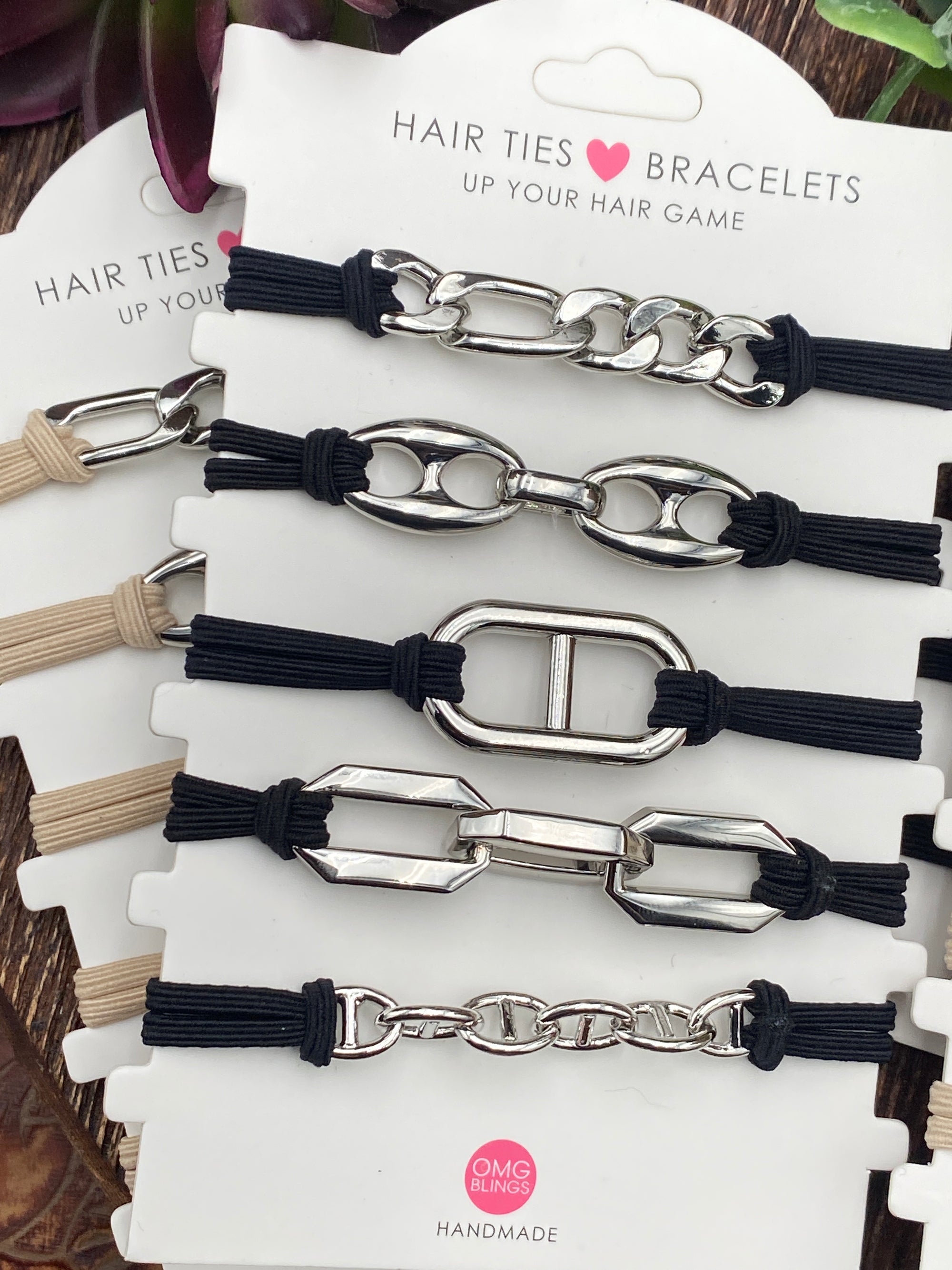 Transform your everyday look with these versatile hair ties that double as stylish bracelets. Available in classic tan or bold black, each piece features your choice of silver, mixed metal tones, or gold accents. Perfect for securing your hair while adding a touch of elegance to your wrist, these dual-purpose accessories keep you looking polished throughout the day. Mix and match colors to match your mood and outfit.