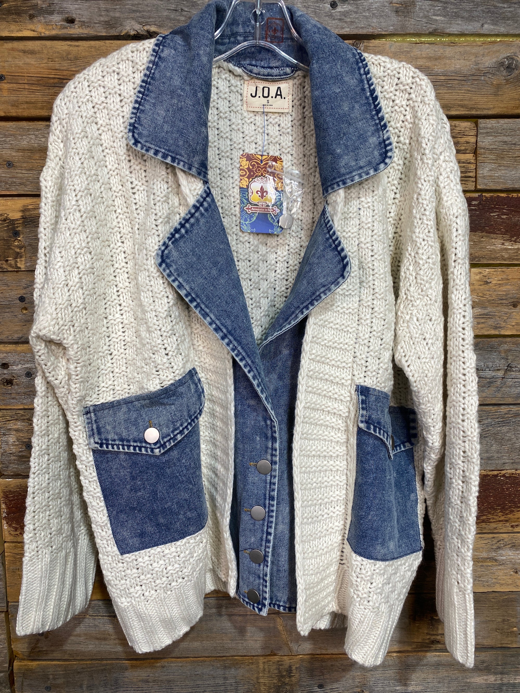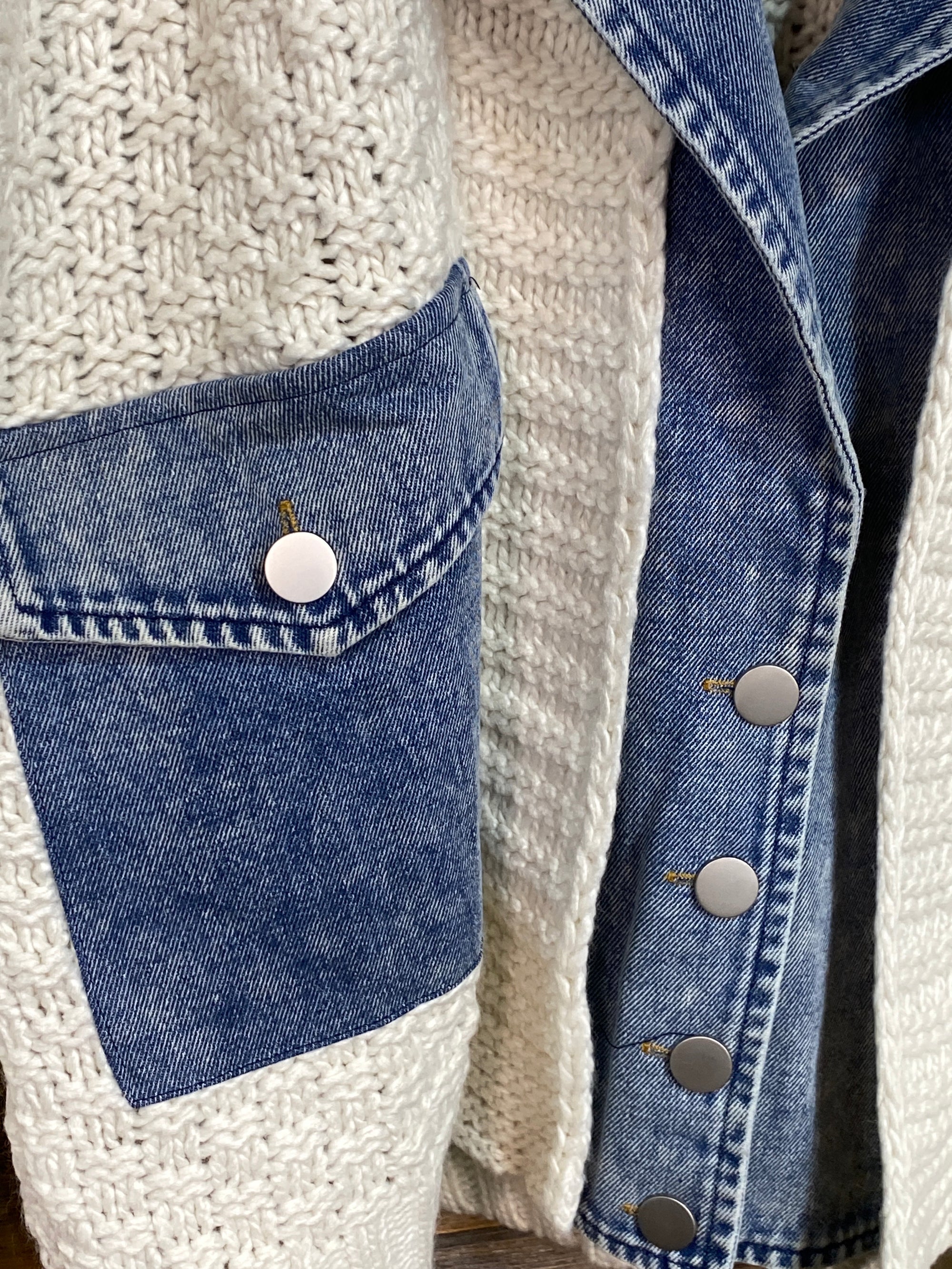 Stay cozy and stylish with the Cable Knit Denim Trim Jacket. Crafted from soft 100% acrylic cable knit, it features a contrast denim trim made of 75% cotton and 25% spandex for comfortable stretch. This natural-toned sweater blends classic warmth with casual denim detailing, perfect for layering from small to large sizes. Its versatile design ensures you feel supported and confident in every season.
