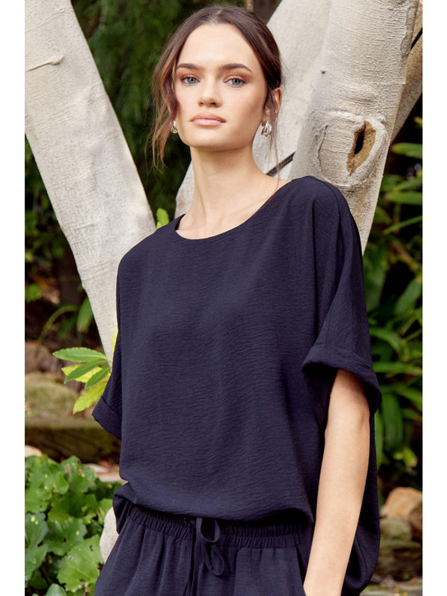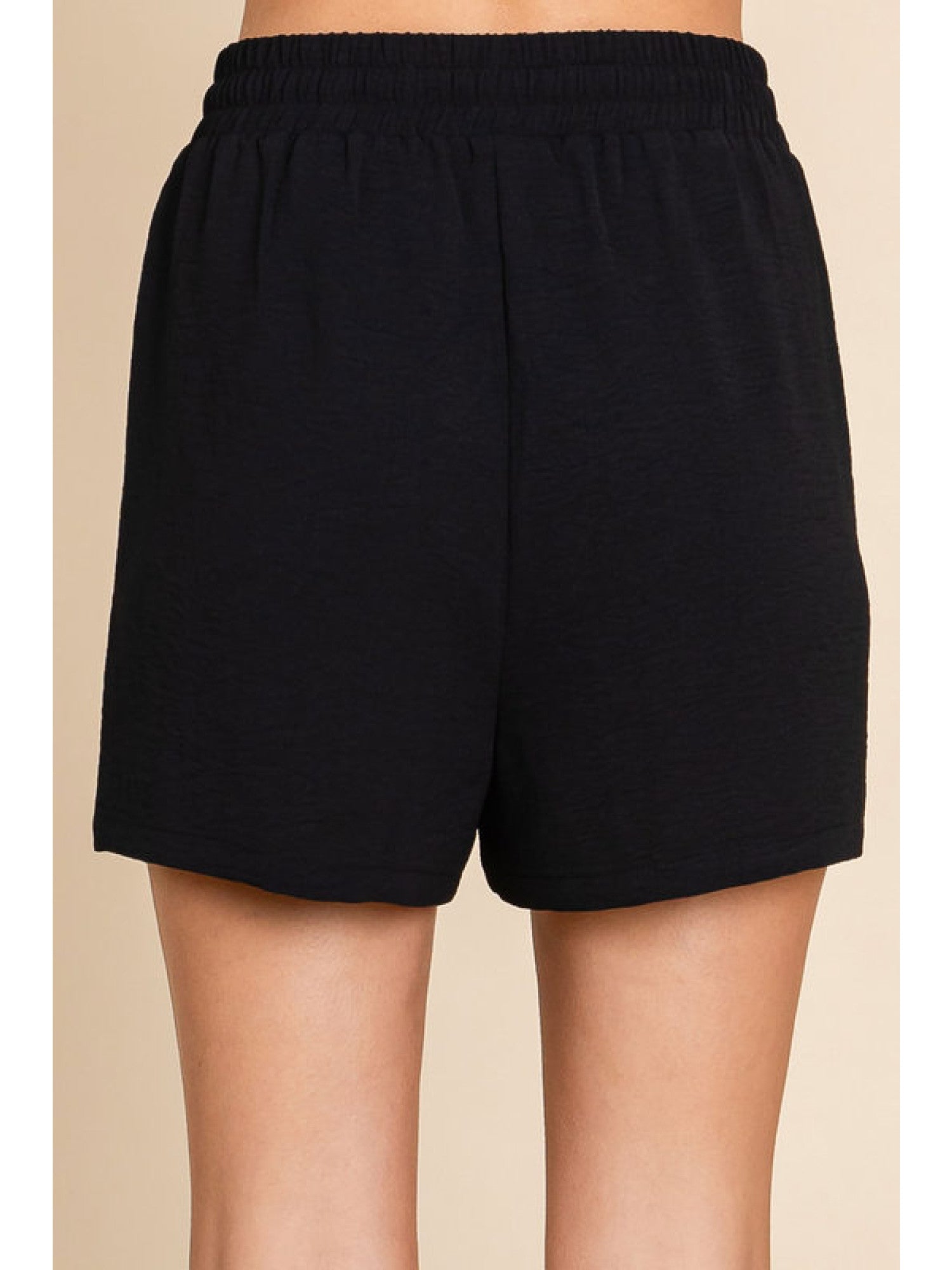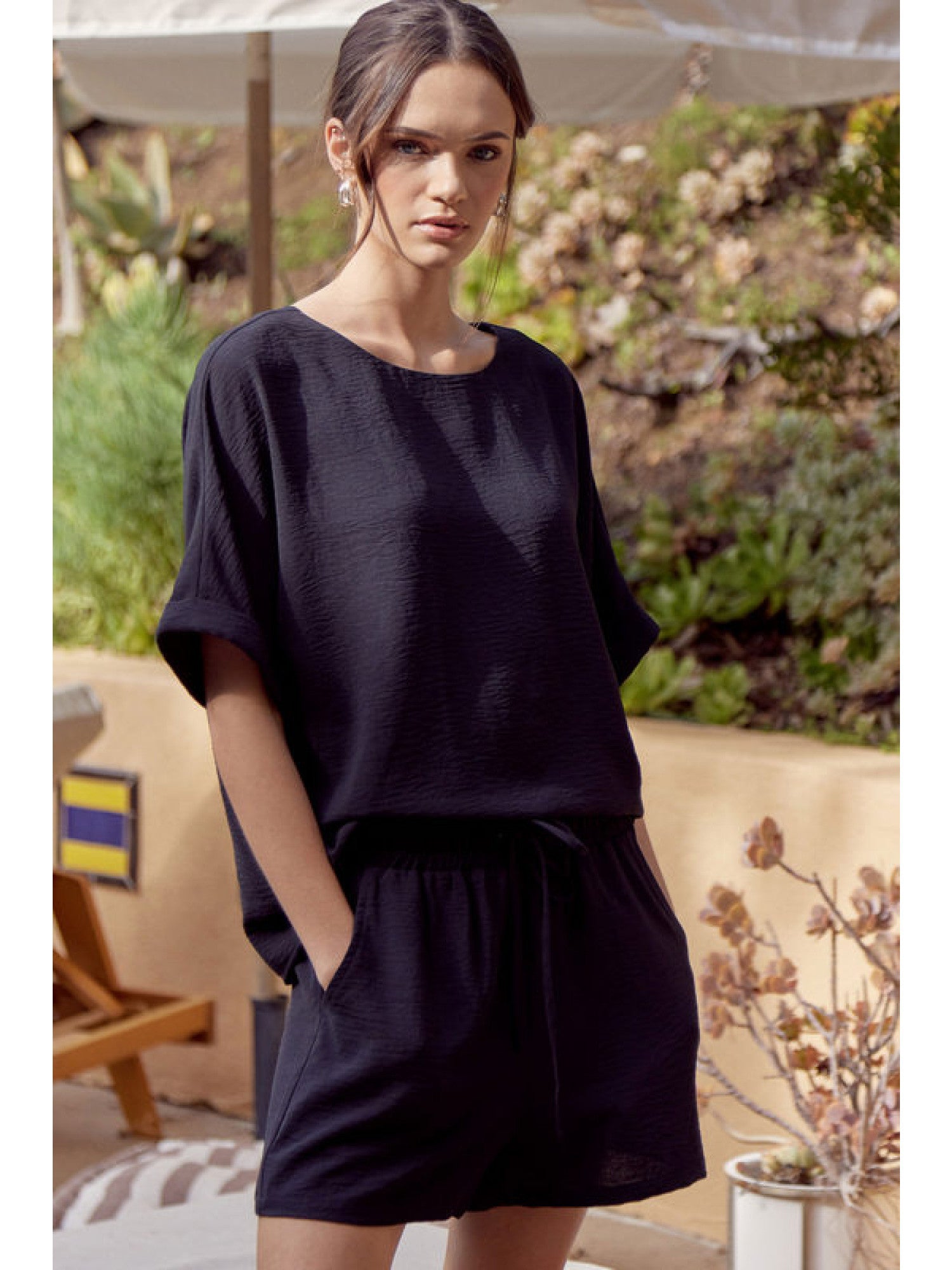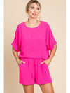 Cozy, stylish, and ready for lounging! Our solid loungewear set features a U-neck top with back inverted pleats, short dolman sleeves, and band cuffs. The drawstring shorts have side pockets for convenience. Made of 95% polyester and 5% spandex, and available in sizes small to 3X. Choose from Hot Pink or Black.