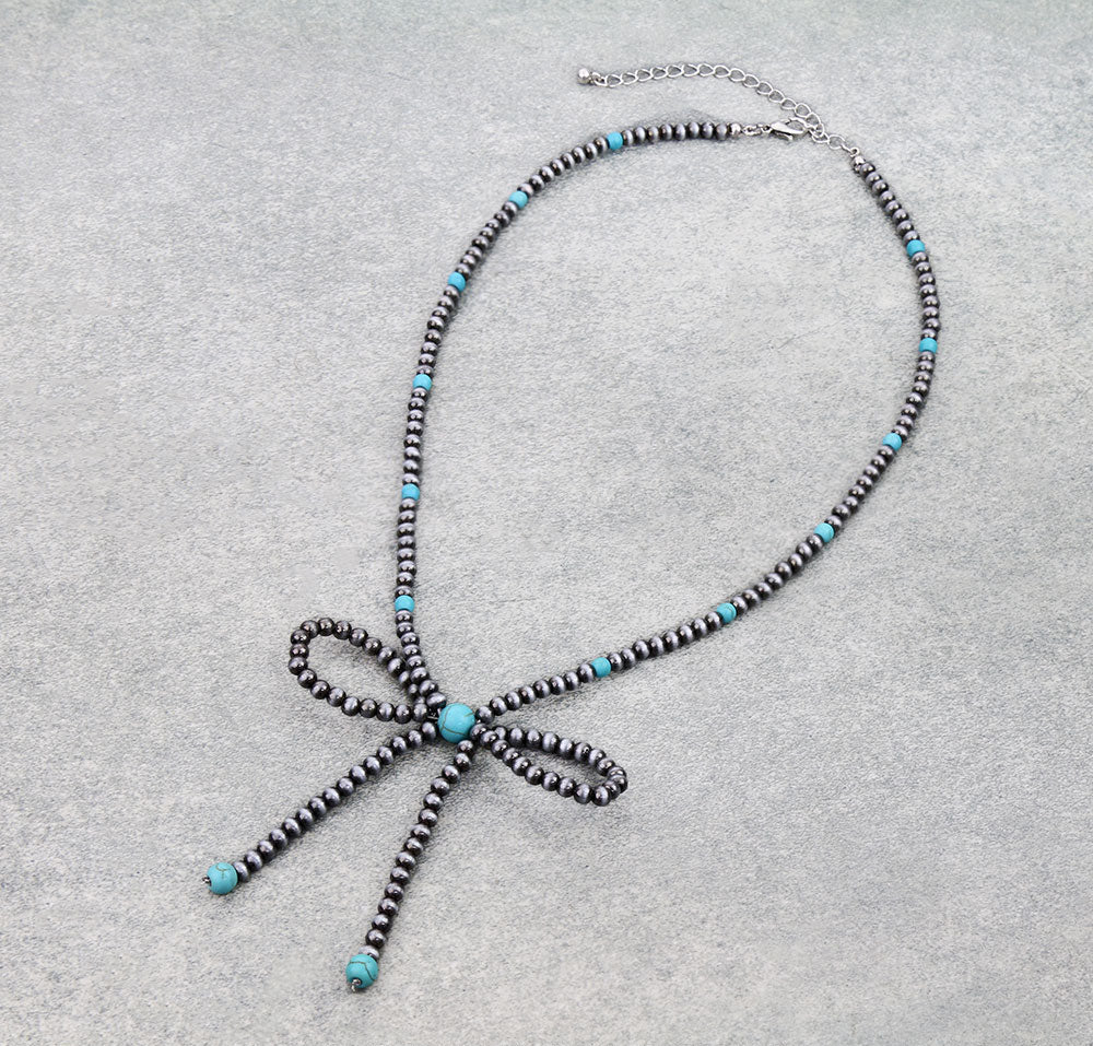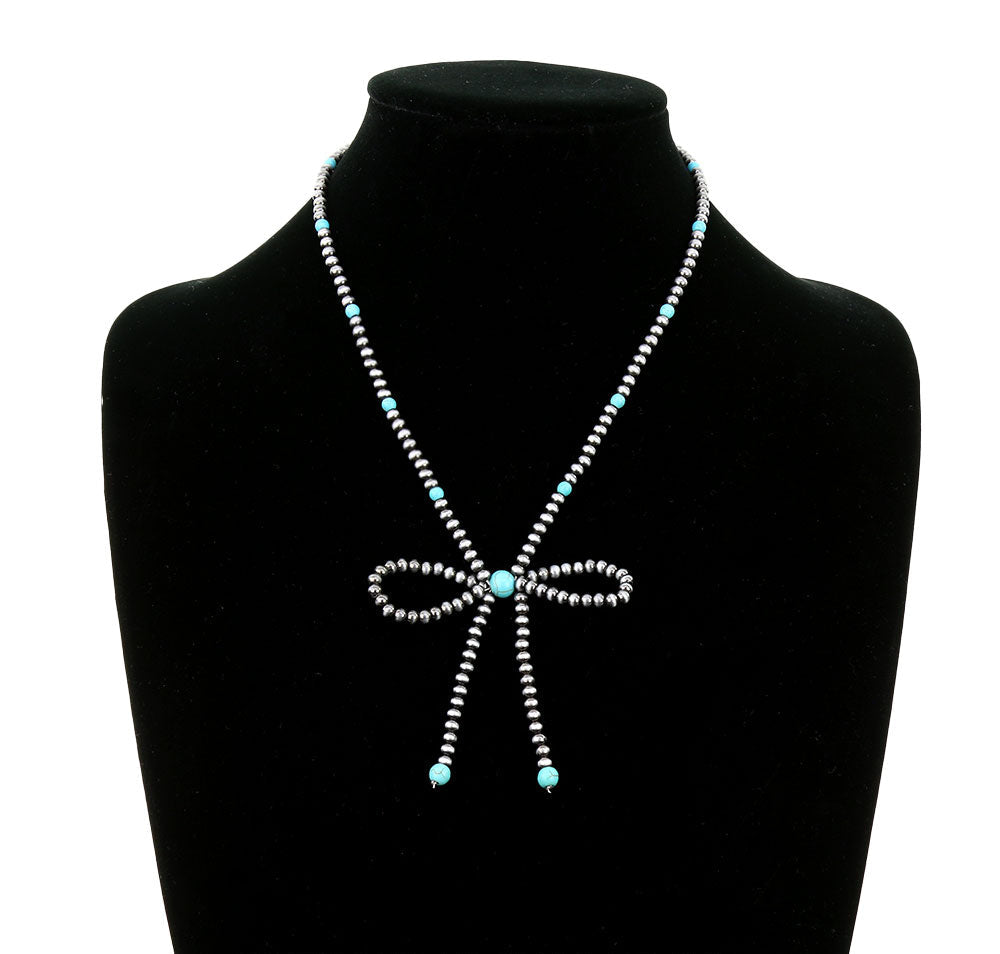 Enjoy the authentic beauty of the Southwest with our Navajo & Stone Bow Necklace. This stunning necklace features an 18" length and intricate Navajo bead detailing. The lobster claw closure with extending hooks adds convenience and versatility. Plus, it's lead and nickel compliant for worry-free wear. Bring a touch of the Southwest to your wardrobe today! Available in 3 colors