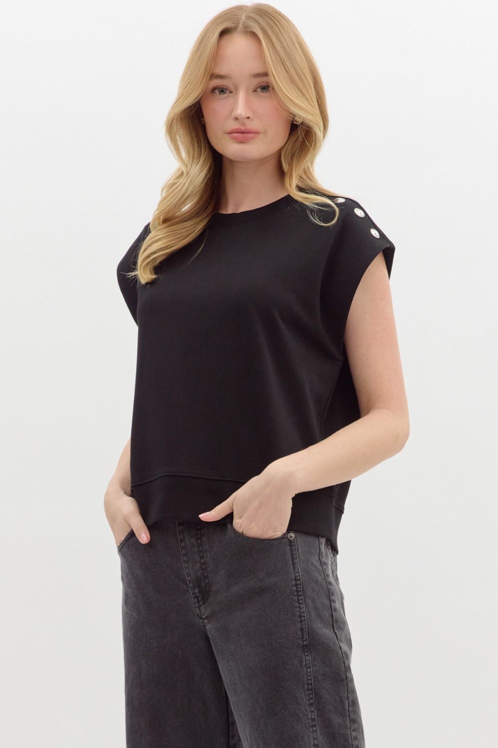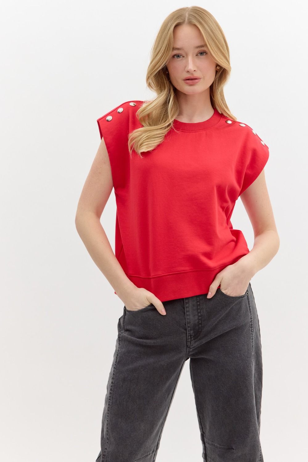 Experience the effortlessly stylish and comfortable Solid Terry Jersey Knit Muscle Pullover Top, designed with accented shoulder studs for an edgy touch. This non-sheer, lightweight knit top will keep you cool and fashionable all day long. Unlined for a smooth and sleek fit.