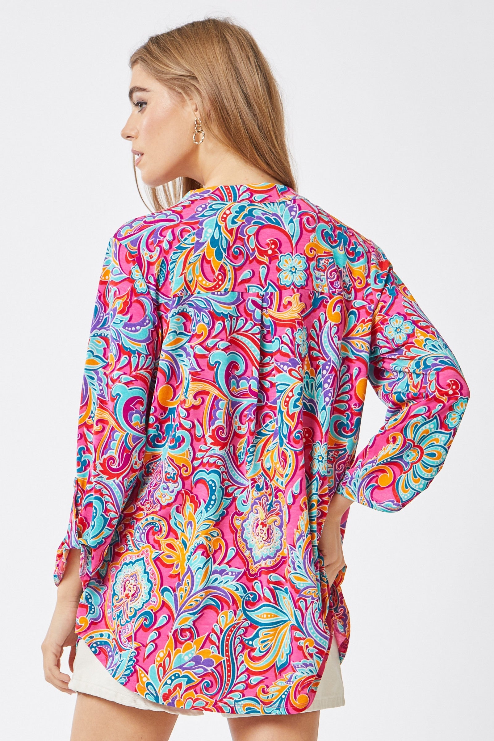 Introducing the Janel Relaxed Flowy Top! Perfect for the ON THE GO lifestyle, our signature top features a poly blend for luxurious softness and lightweight, wrinkle-free comfort. The China collar neckline and 3/4" length sleeves with tab details create a relaxed, flowy fit with a slight high low. Plus, this easy care fabric is cooler than linen, making it perfect for travel.