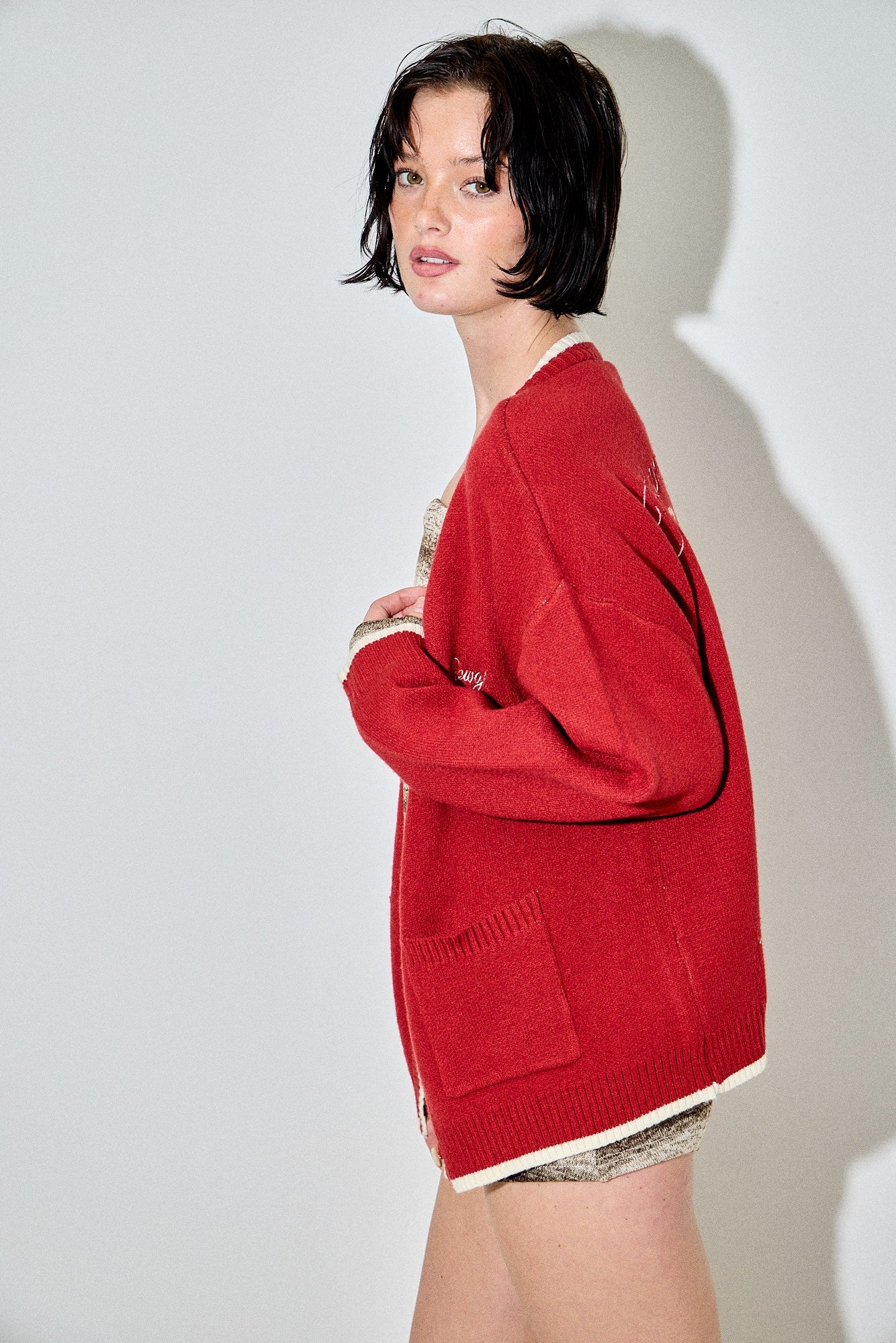 This Red Horseshoe Cardigan combines elegance and comfort with a soft blend of 50% viscose, 28% polyester, and 22% nylon. Featuring a flattering V-neck and delicate cursive writing paired with a floral horseshoe design, it adds a refined touch to any outfit. Practical front pockets enhance functionality without compromising style, making this cardigan a versatile addition to your wardrobe.