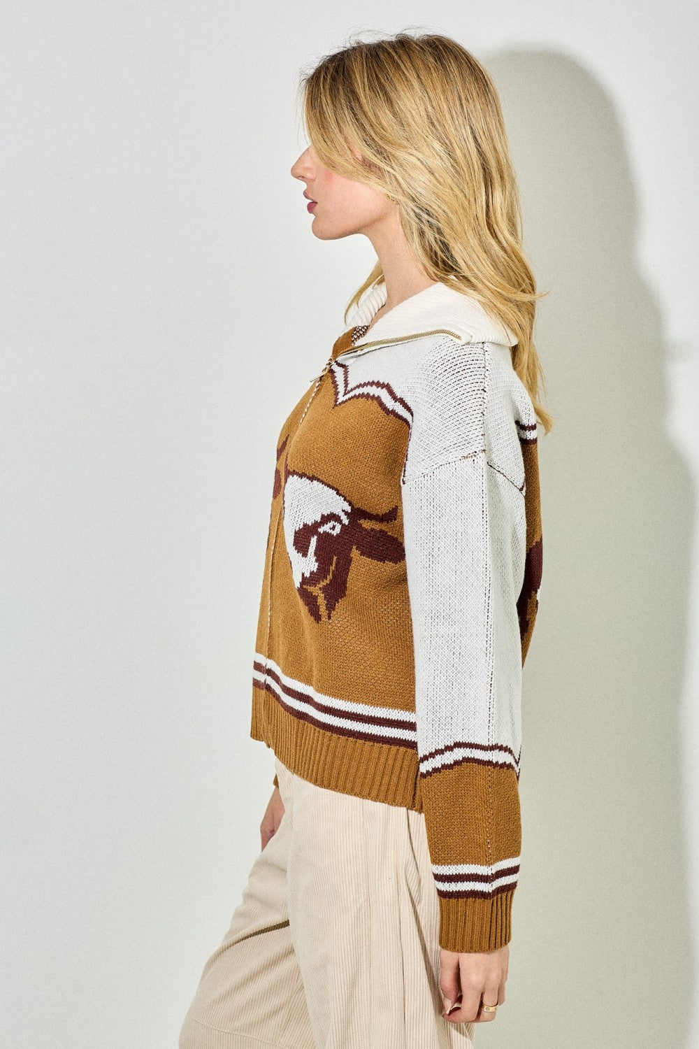 This Bull Zip Sweater Cardigan features a classic Peter Pan collar and a full zip-up front for easy wear. Crafted from 100% polyester, it offers lightweight warmth with a smooth feel. The long sleeves and vibrant multi-print design provide both comfort and style, making it a versatile addition to your wardrobe for transitional seasons.