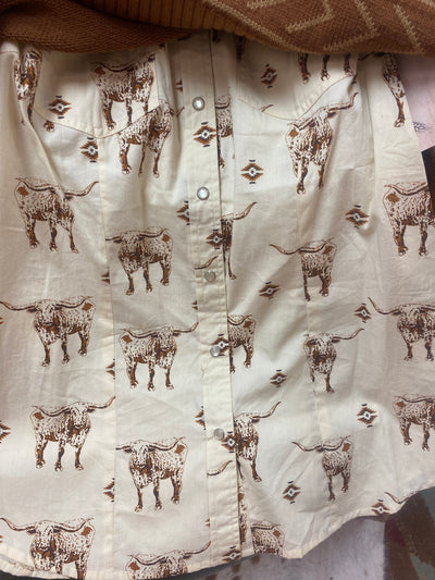 Elevate your style with our Longhorn Pearl Snap Top. This versatile piece, available in tan, is designed with long sleeves and comes in sizes small to xlarge. Perfect for any occasion, it's sure to make a statement and add a touch of sophistication to your wardrobe.