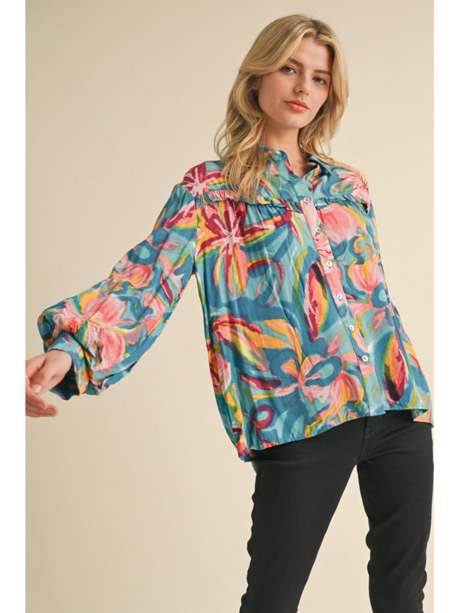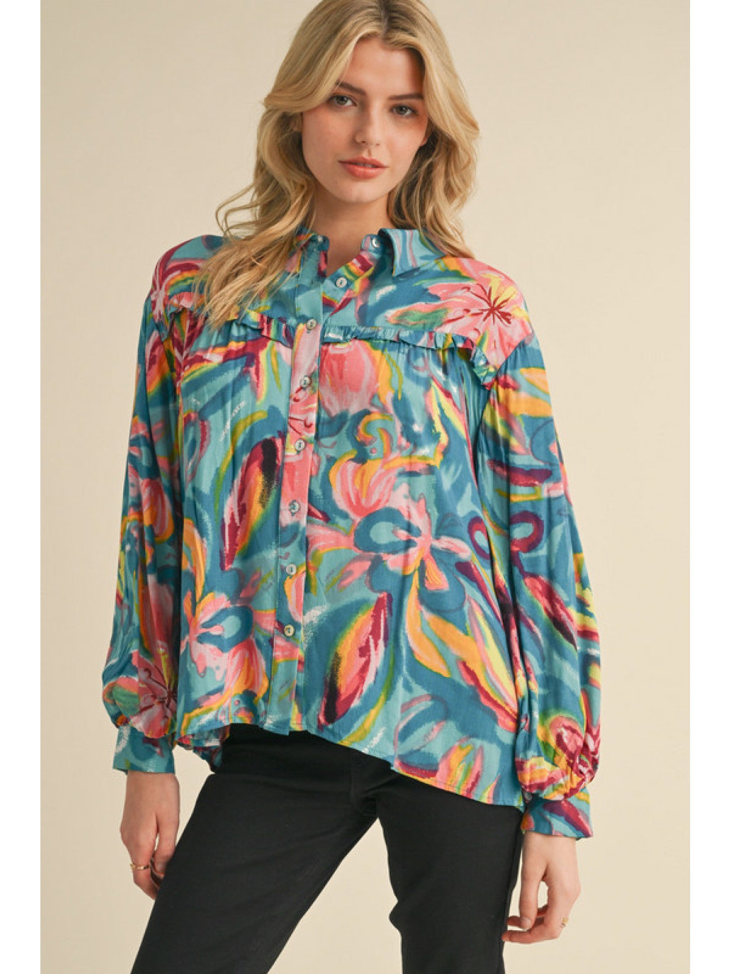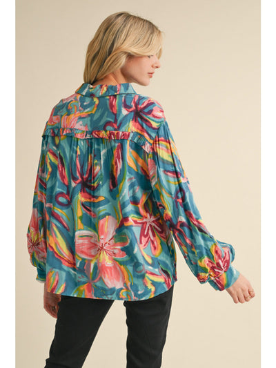 Step up your style game with our Teal Mix Printed Blouse. The eclectic mix of colors and playful print will make a statement. The collared neck and frilled yoke with shirring add a touch of flair. Lightweight and non-sheer, this blouse is perfect for any season. Available in sizes Small to Large.