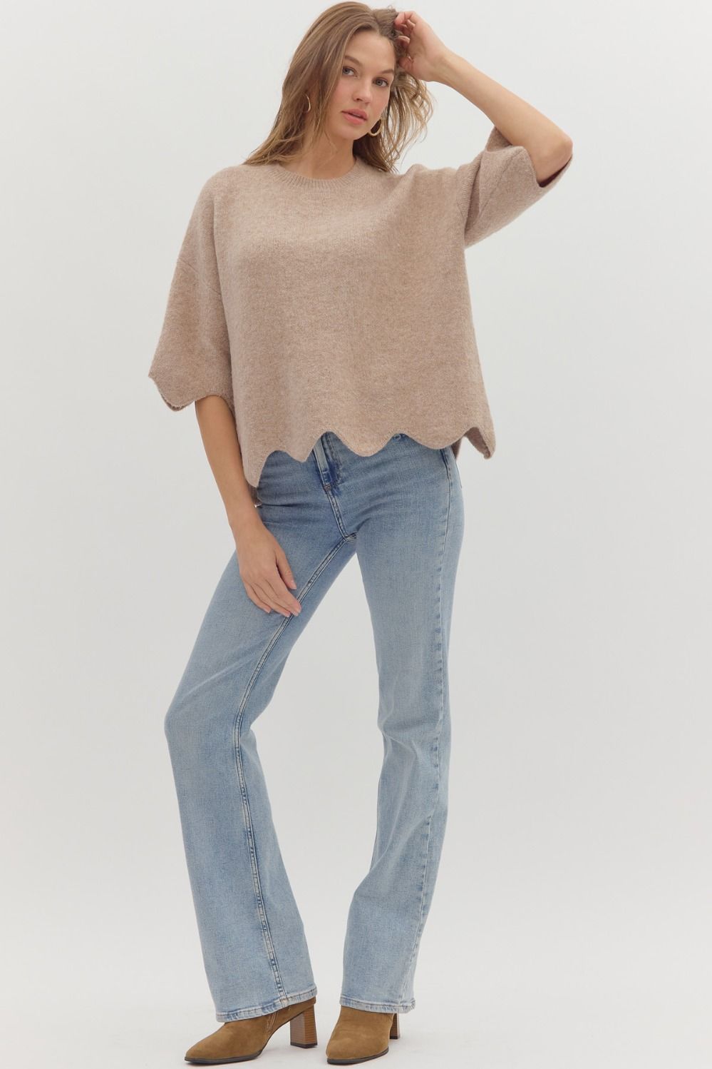 Elevate your wardrobe with this tan knit relaxed sweater, designed to stand out with its scalloped hem and ¾ sleeves. Crafted from a lightweight blend of acrylic, polyester, and spandex, it offers unmatched comfort and a fluid fit that dares to break away from the ordinary. Perfect for layering or wearing solo, this pullover tops any look with effortless edge.