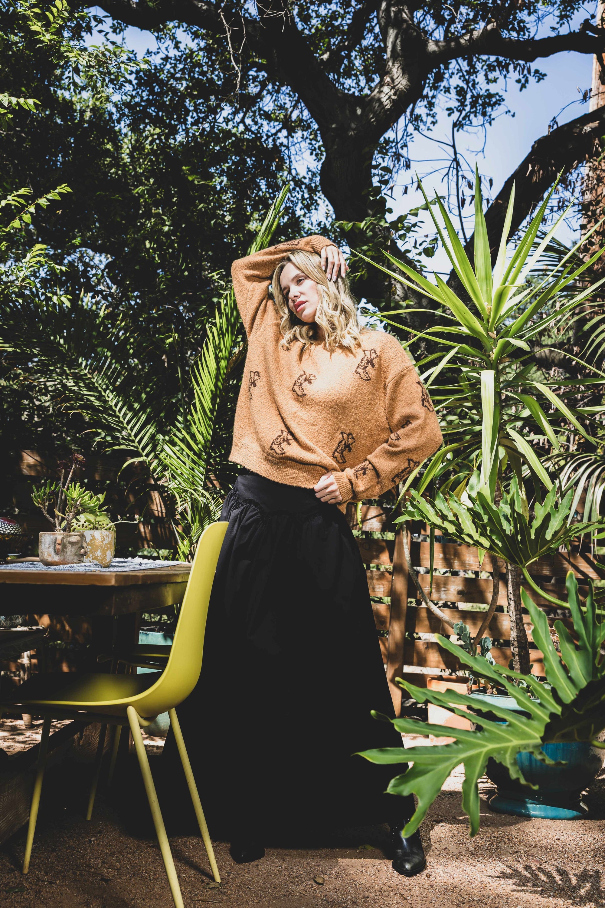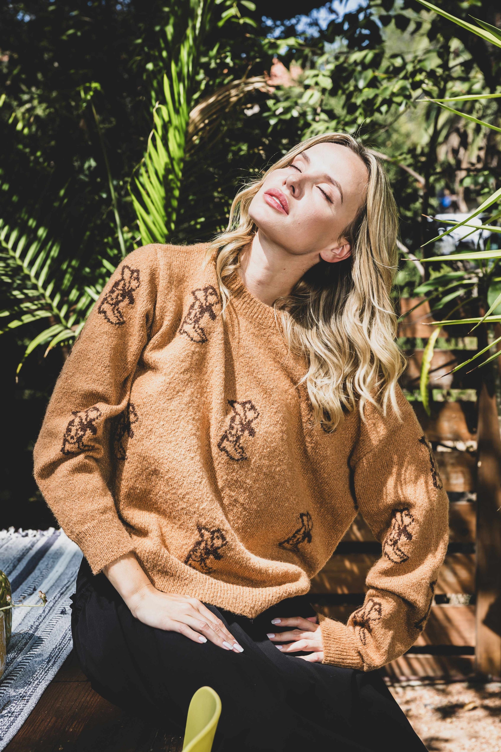 Add a stylish Western flair to your wardrobe with this cozy knit sweater featuring a distinctive allover cowboy boots pattern. Made from a soft caramel brown blend of polyester, polyamide, wool, and spandex, it offers warmth and gentle stretch for comfortable layering. The relaxed silhouette pairs effortlessly with any outfit, while ribbed cuffs and hem provide a refined yet casual finish, making it an ideal choice for cooler seasons.
