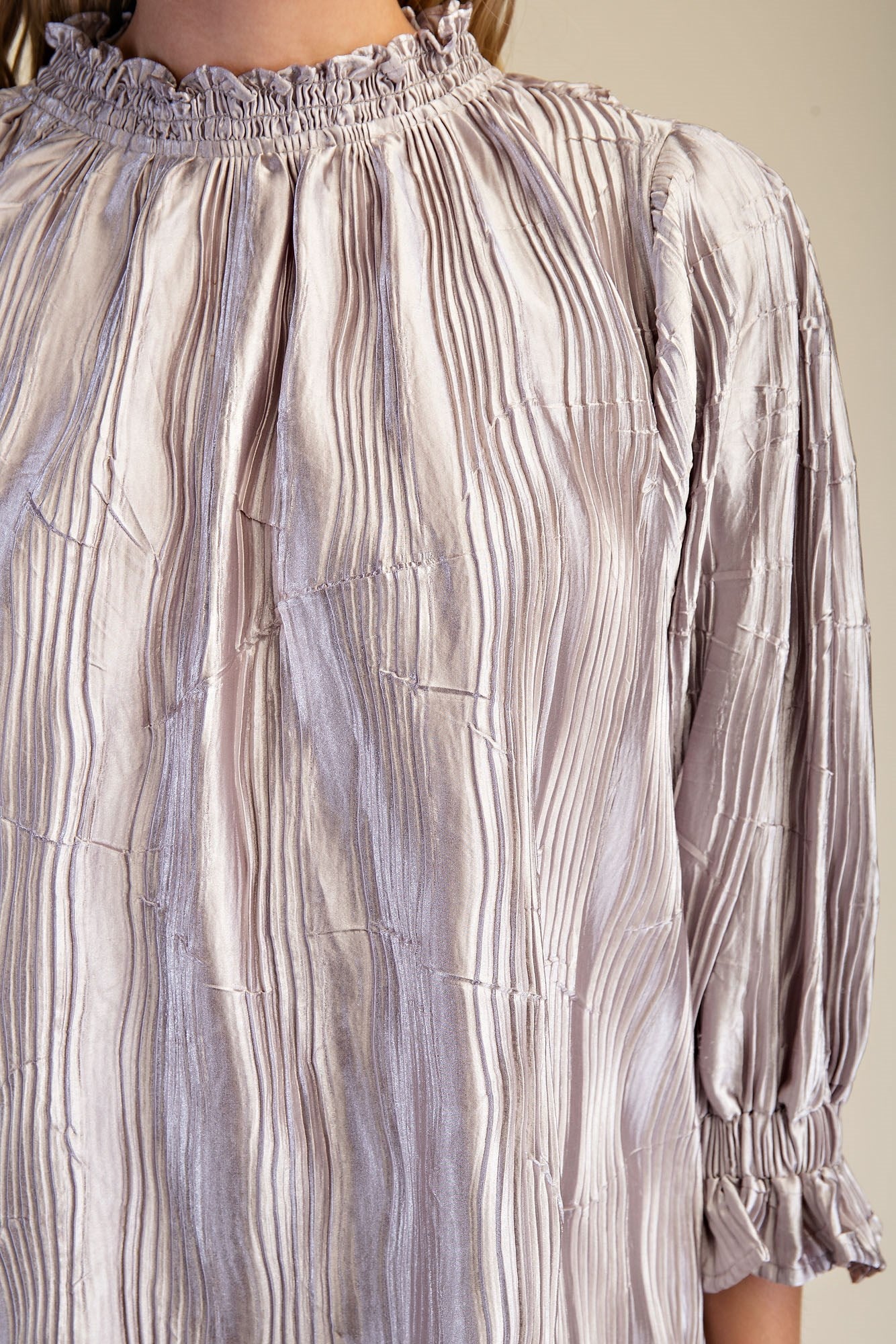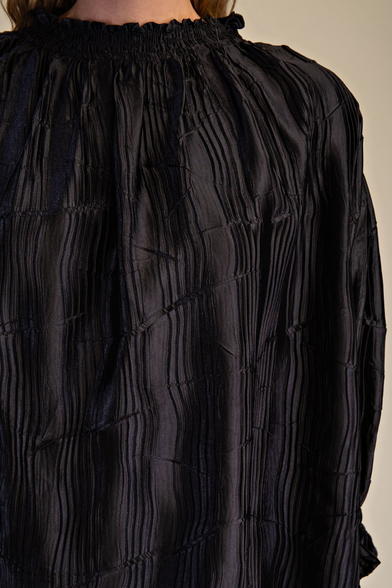 The Deatra High-Neck Puff Sleeve Top brings playful charm with its pleated textured fabric in two stunning colors: sleek black and soft champagne. Made from 100% polyester, this top combines fun design with comfortable wear, making it your new go-to for adding a flirty touch to any outfit.