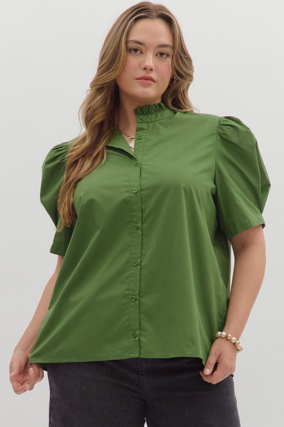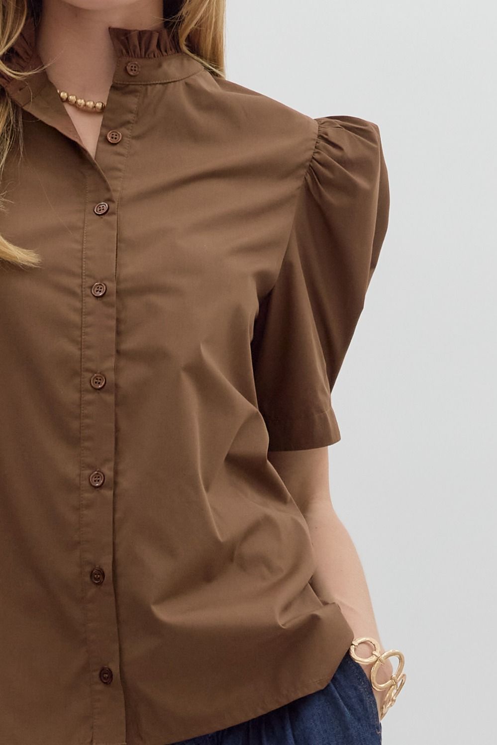 This playful top showcases solid puffed shoulders and short sleeves, with a charming button-front and a ruffled band collar for a flirty touch. Made from a lightweight, woven fabric that’s non-sheer and unlined, it blends 65% polyester with 35% cotton for comfy wear all day.