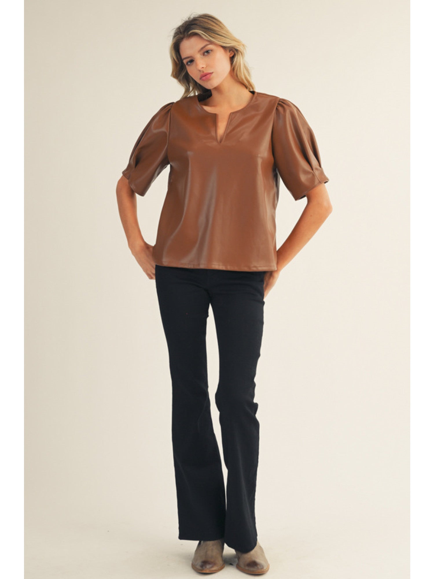 Add a touch of edgy chic with the Gia Pleather Blouse, featuring playful short puff sleeves and stylish pintuck details. Crafted from a sleek blend of polyester and polyurethane, this top brings glam in both Black and Caramel shades. Perfect for turning heads and upping your style game!