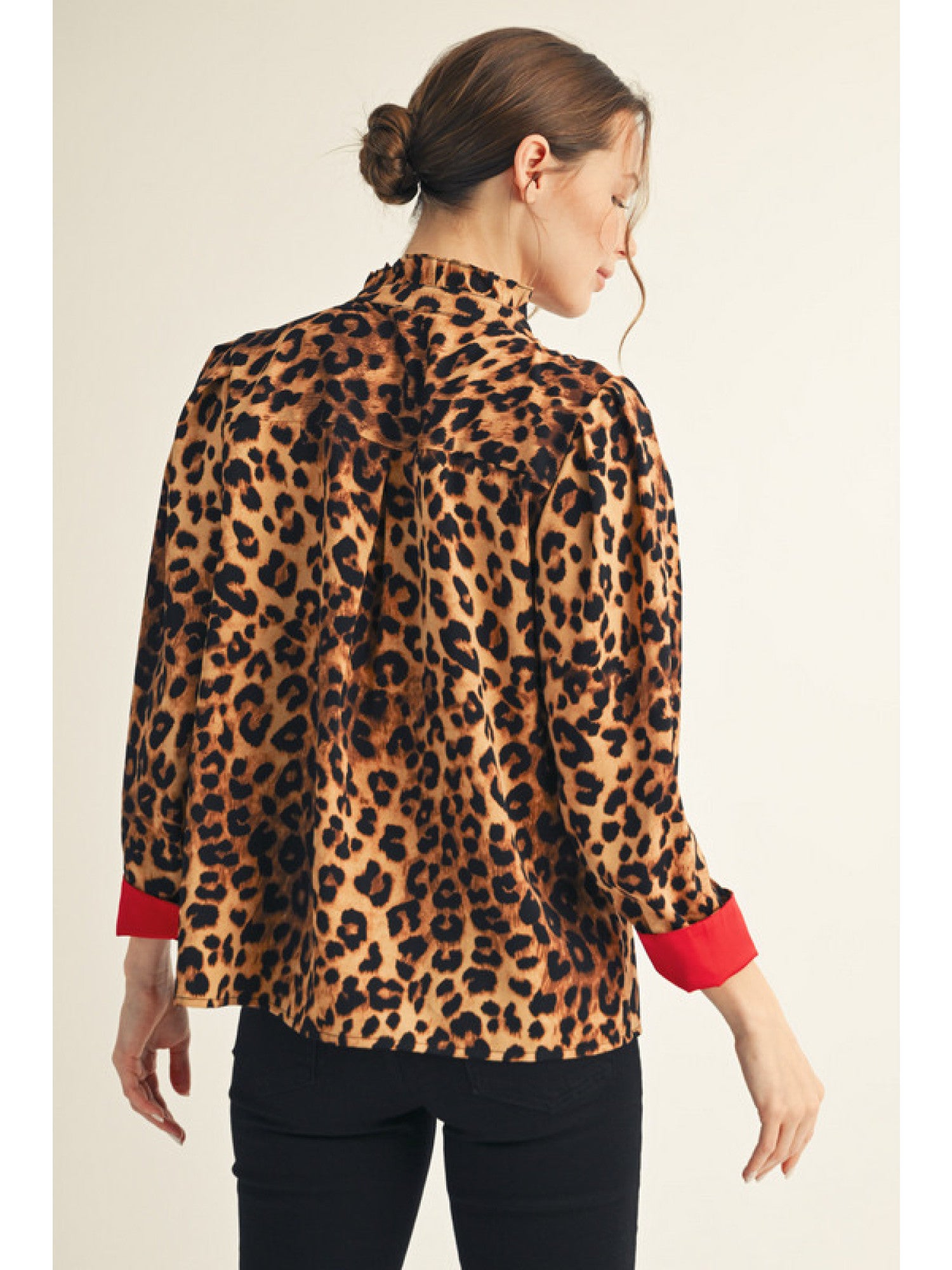 This long-sleeve button-down blouse features a bold leopard print with a charming ruffled neck for added elegance. The solid contrast accents elevate its style, making it perfect for both work and casual outings. Crafted from 100% polyester, it offers comfortable wear with easy care. Embrace your unique style confidently with this versatile and flattering top.