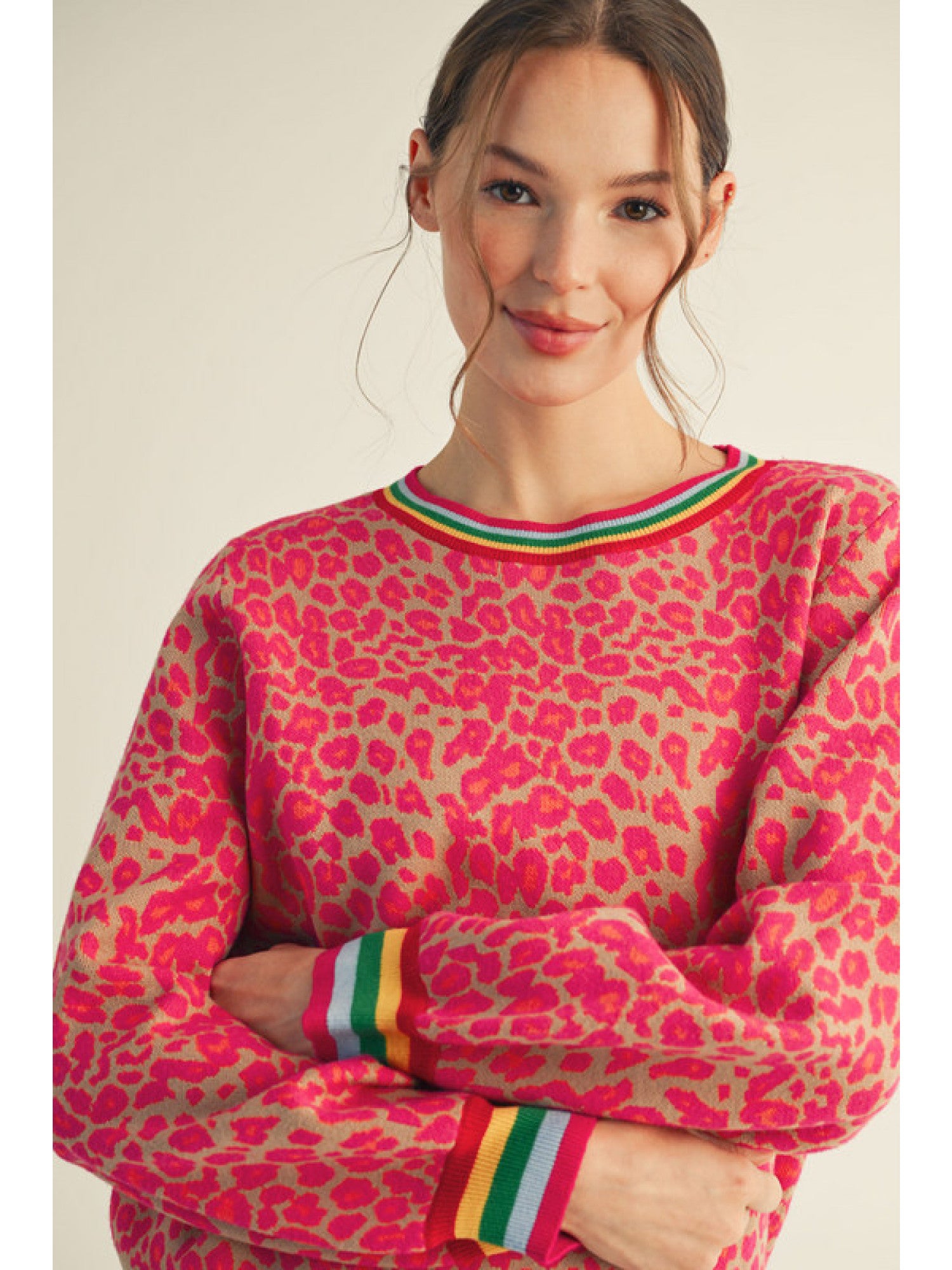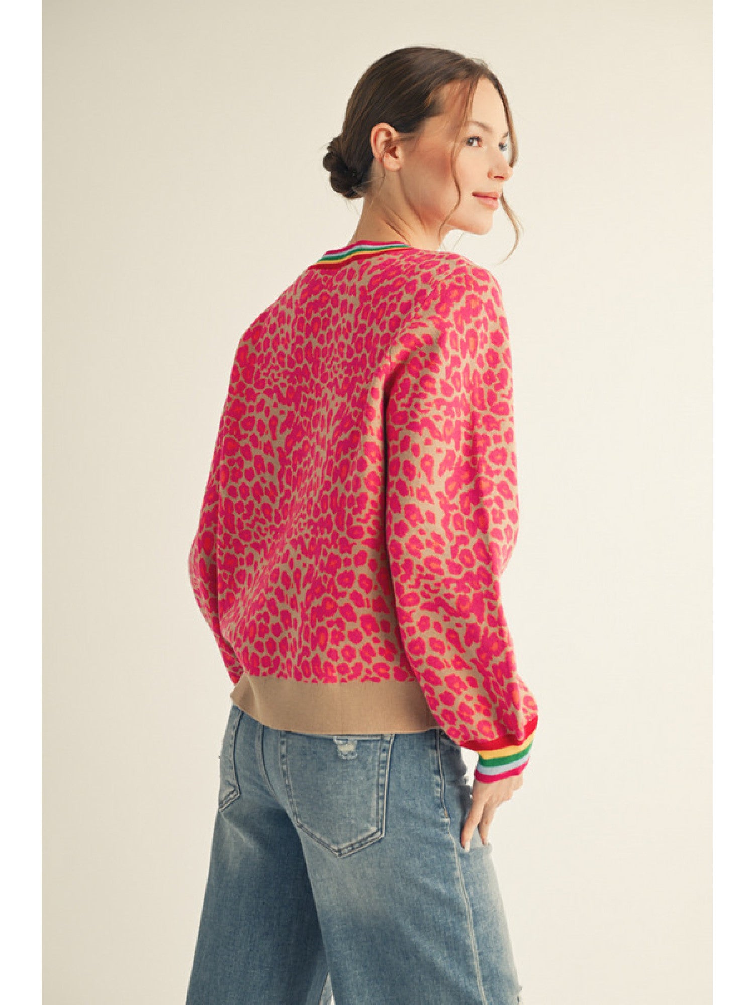 This leopard sweater top combines bold style with cozy comfort, featuring long puff sleeves and vibrant multi-color binding at the neck and cuffs. Crafted from a soft blend of viscose, polyester, and nylon, it offers a gentle feel against your skin. Available in animal print with hot pink accents, it adds a playful touch to your wardrobe. Designed to flatter, this top is modeled by a 5'10" wearer in size Small, ensuring a comfortable and stylish fit you'll love.