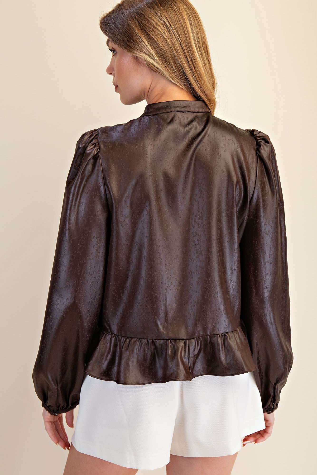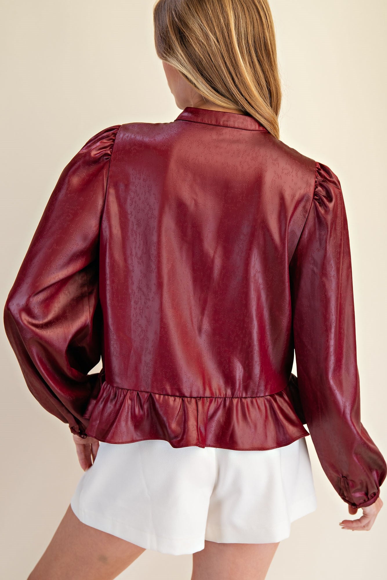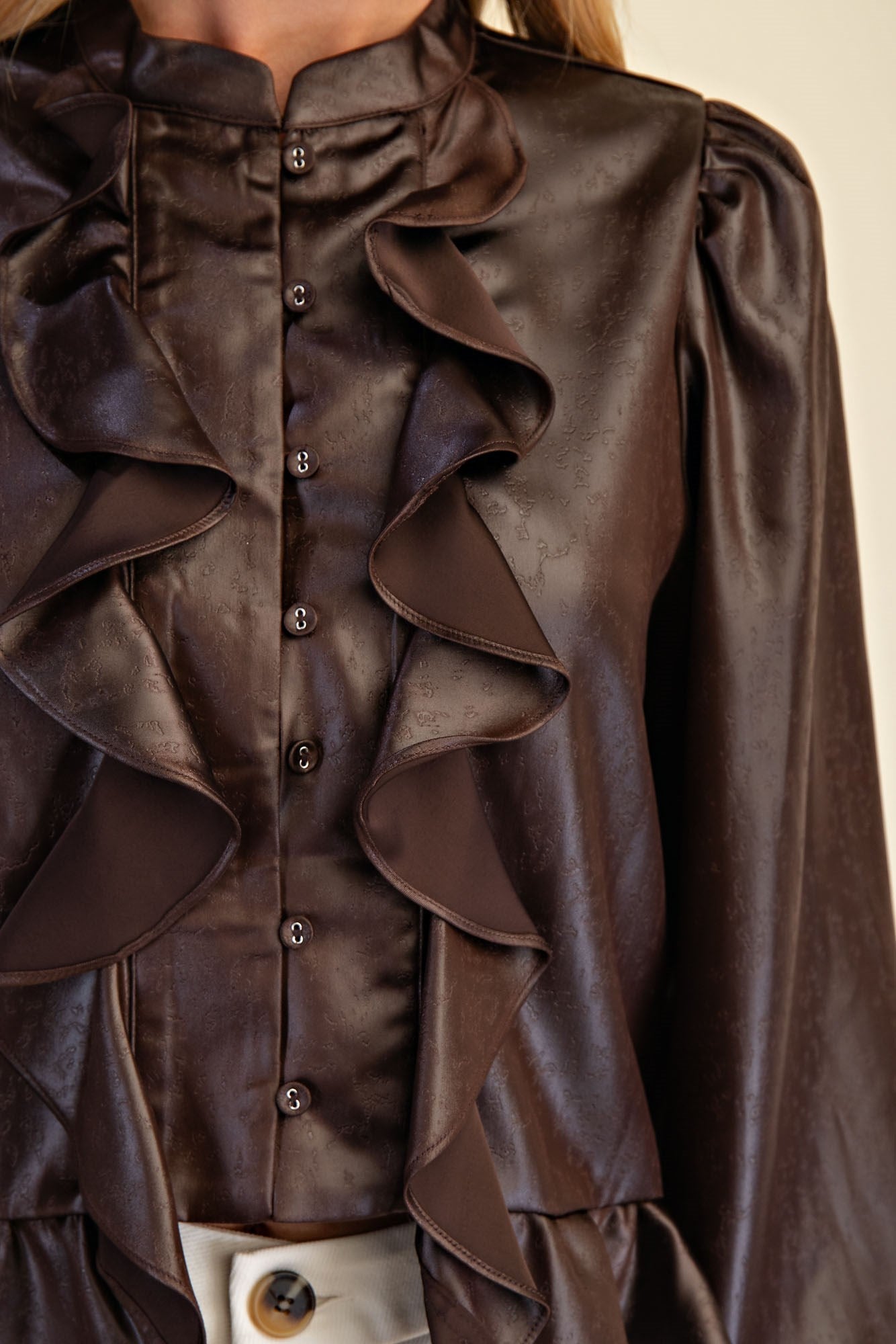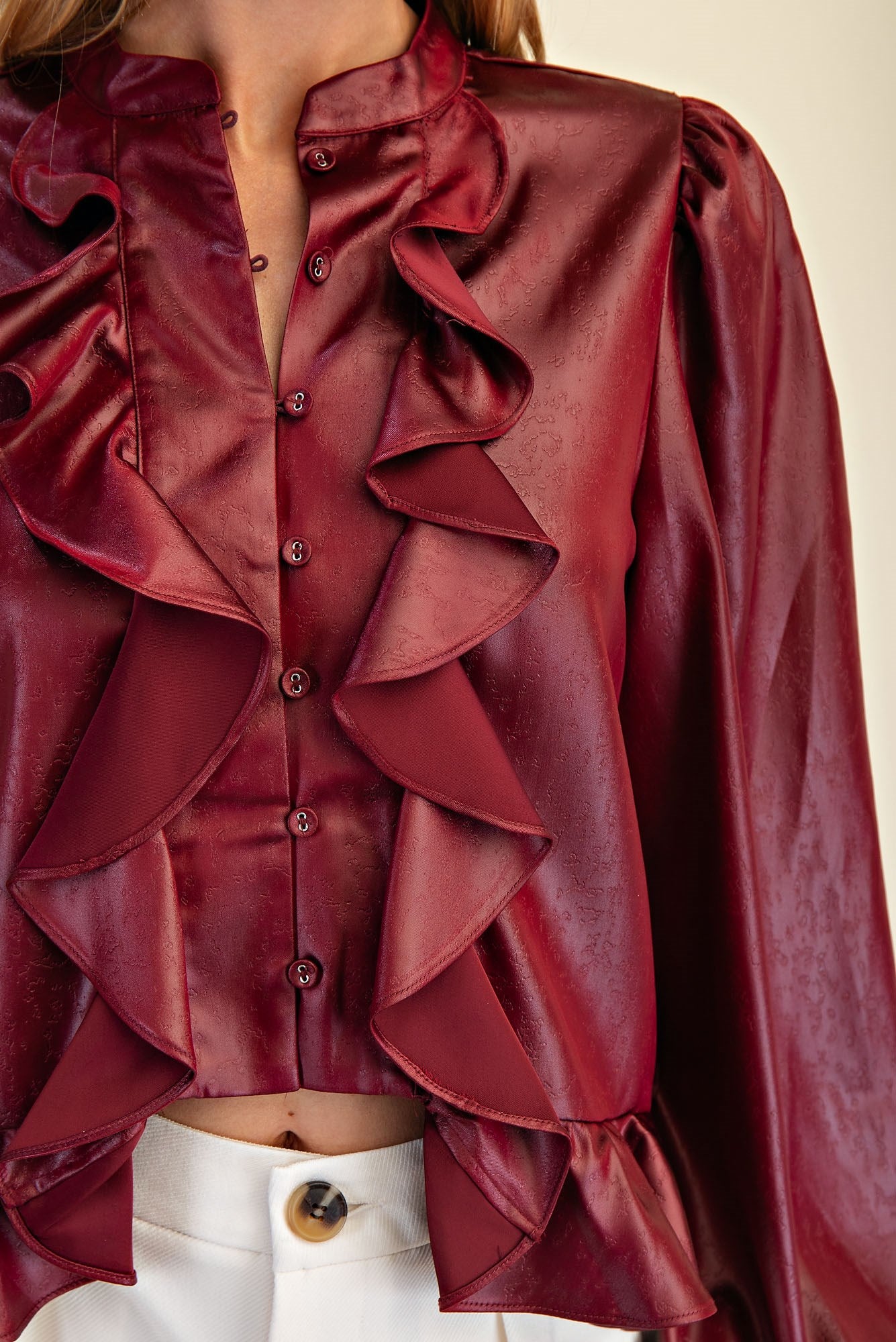 This Long Sleeve Ruffle Top features delicate ruffles along the front and sleeves, adding a feminine touch to your outfit. Made from 100% polyester, it ensures a comfortable fit and easy maintenance. Available in warm brown and rich wine shades, this top is designed to keep you feeling confident and supported throughout your day.