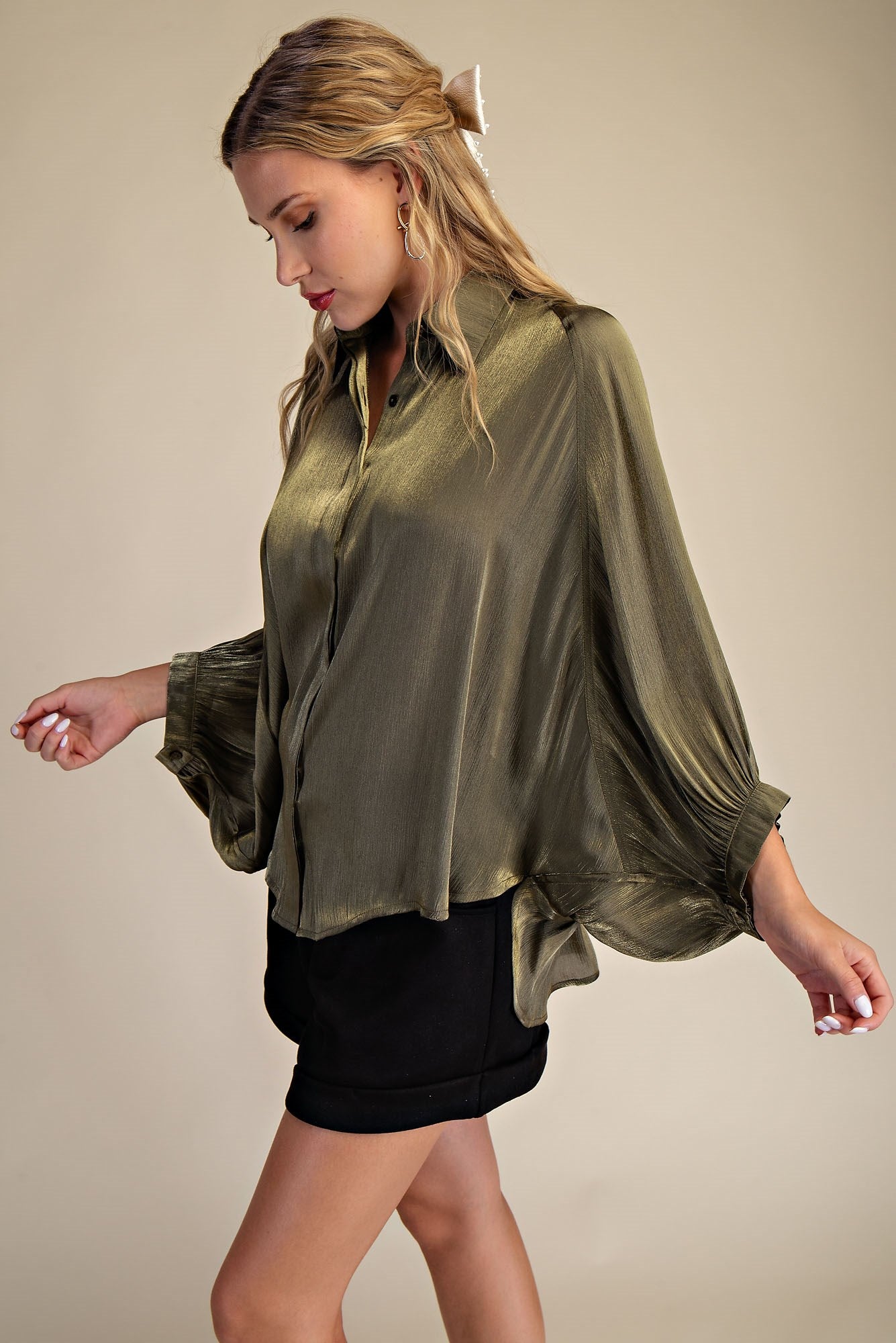 This Olive Button Cape Shirt features a refined cape-style silhouette crafted from olive shimmer fabric, lending a subtle glow to your look. Made from 100% polyester, it offers lightweight comfort and graceful drape, making it an elegant addition to any sophisticated wardrobe.