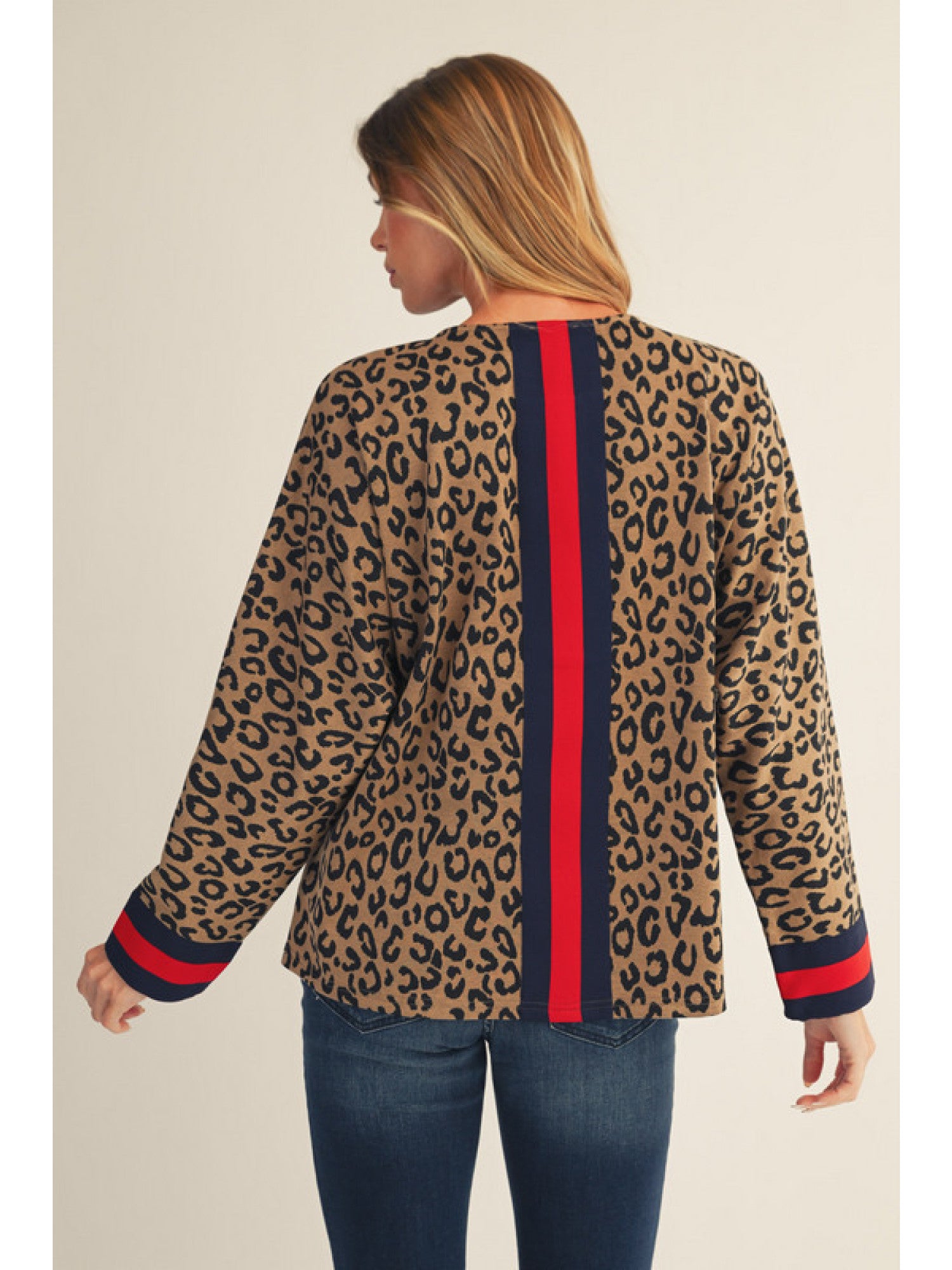 The RG Leopard Long Sleeve Top combines a sophisticated drop shoulder design with subtle ribbed color band accents for a refined look. Available in Taupe with Red/Green and Toffee with Red/Navy, this top blends classic leopard print with tasteful color detailing. Made from a soft, stretchy fabric of 98% polyester and 2% spandex, it offers both comfort and elegance for a polished wardrobe staple.