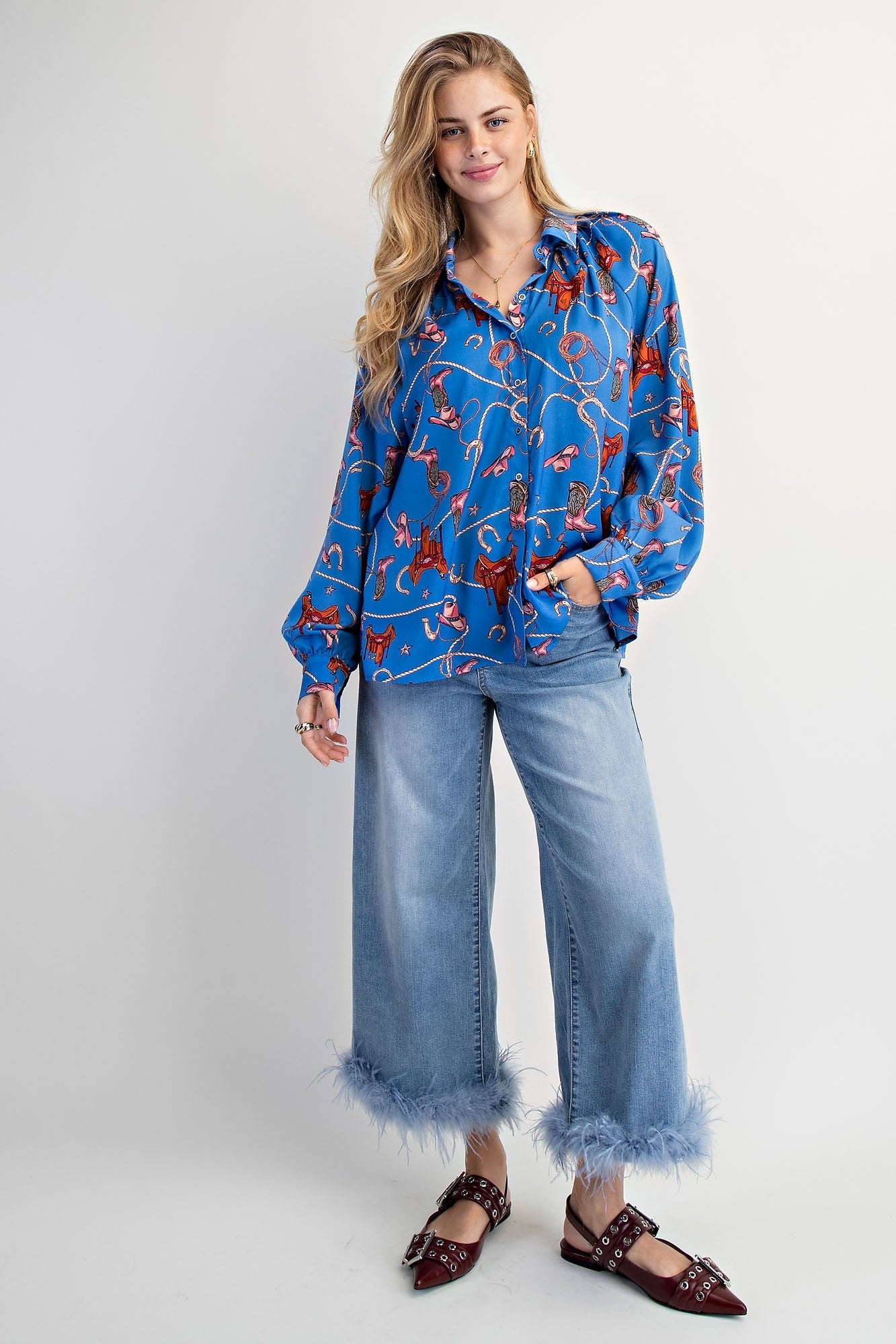 The Western Printed Mirabelle Satin Shirt in pearl blue offers a relaxed, oversized fit with a button-down placket and delicate collar details. Designed with a slight A-line drape, its flowy silhouette provides ease of movement and a flattering shape. Crafted from 100% polyester, this shirt measures 26 5/8" in length and 25" across the bust in size small. It pairs effortlessly with the matching lounge set (sold separately) for a coordinated, stylish look that combines comfort with expert tailoring.
