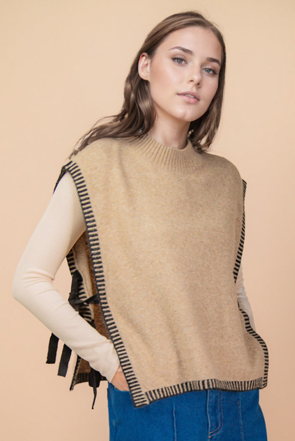 Elevate your layering game with the Whipstitch Knit Sweater Vest. Featuring a chic mock neck and eye-catching contrast whipstitch detail, this vest adds texture and style to any outfit. Lightweight yet cozy, it effortlessly enhances your look while keeping you comfortable. Perfect for styling over shirts or dresses, it’s a versatile staple designed to turn heads.