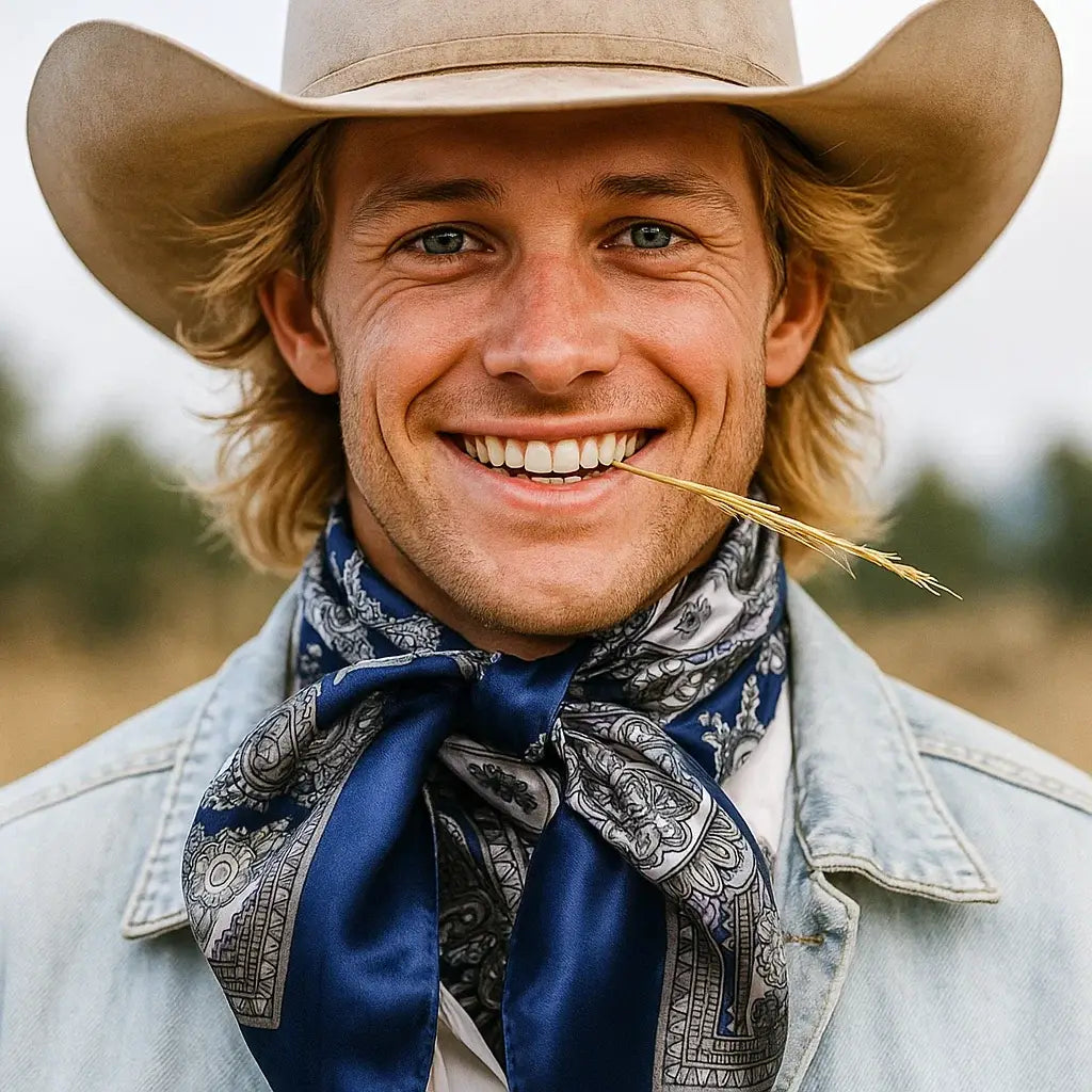Our classic Blue Paisley wild rag/scarf It is a square and measures 35" x 35". A perfect look for any rodeo event or a night out on the town. Can be just knotted or complimented with a concho slide. 100% machine washable polyester, silky and soft.