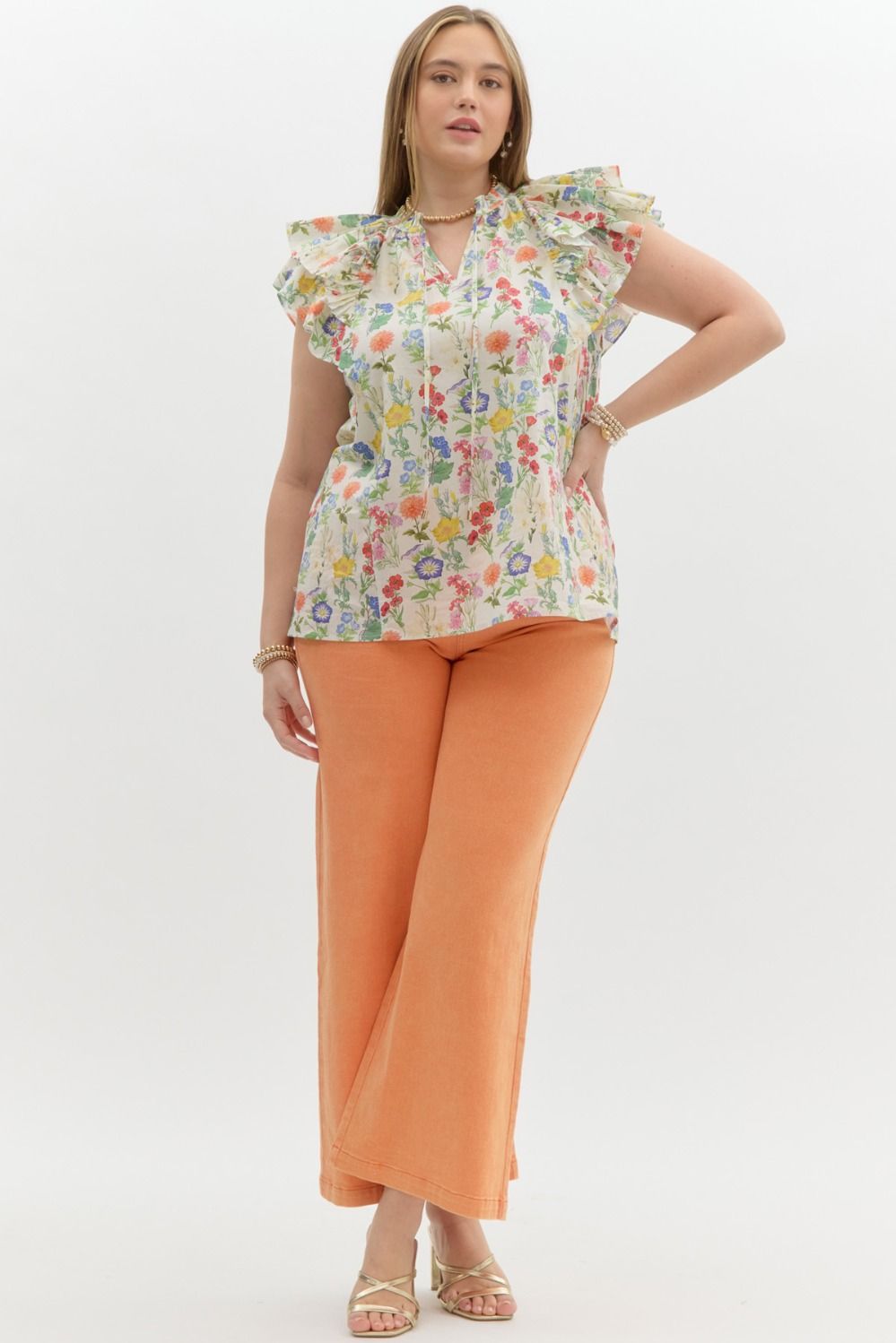 This lightweight pullover top features a lovely floral print and double layer ruffle sleeves for a touch of charm. Made of woven cotton fabric, it is unlined and non-sheer, making it perfect for any occasion.