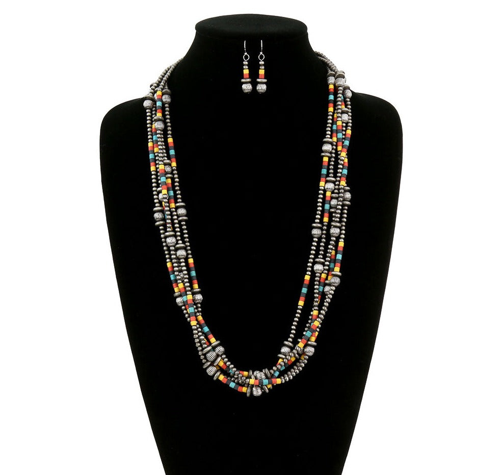 Aralia 5 Strand Fashion Beaded Varied Navajo Necklace, Earrings & Bracelet - Multi