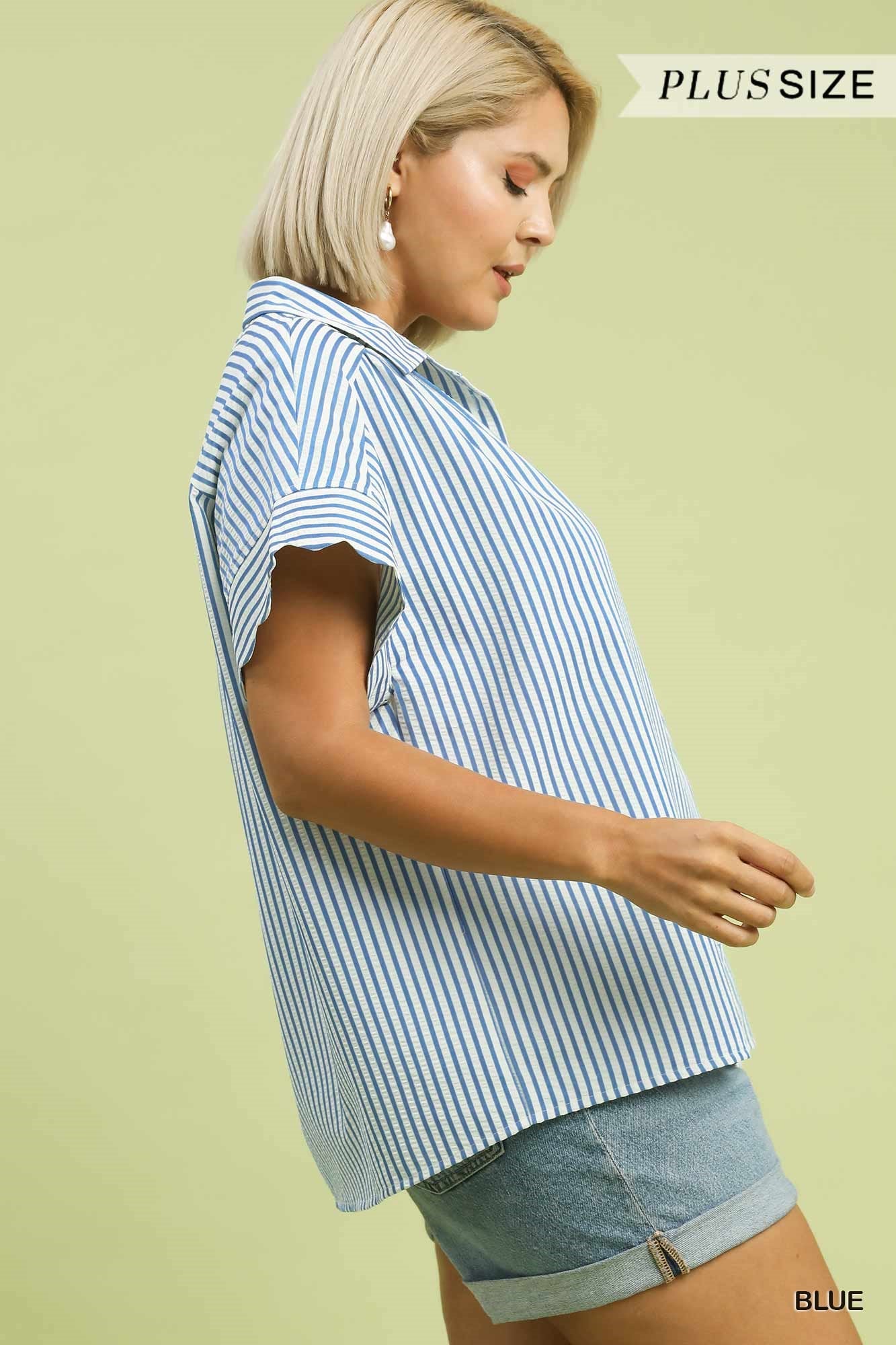 Discover timeless style with this striped button-down top that combines classic appeal with modern flair. The vertical stripe pattern pairs beautifully with a crisp collar and functional buttons, while the flowing dolman sleeves feature delicate scalloped edges for added sophistication. Crafted from 100% polyester, this unlined top offers comfortable wear throughout the day. Whether you're dressing up for work or keeping it casual, this versatile piece adapts to your lifestyle with ease and confidence.