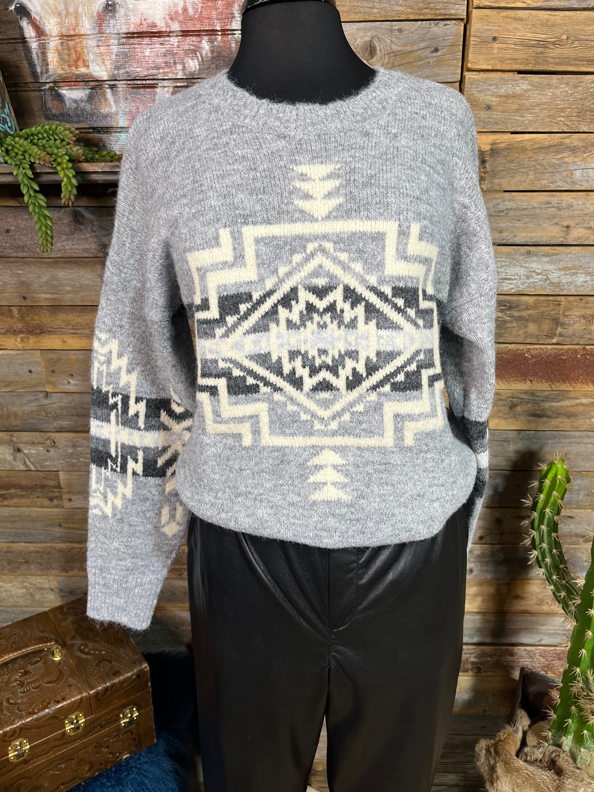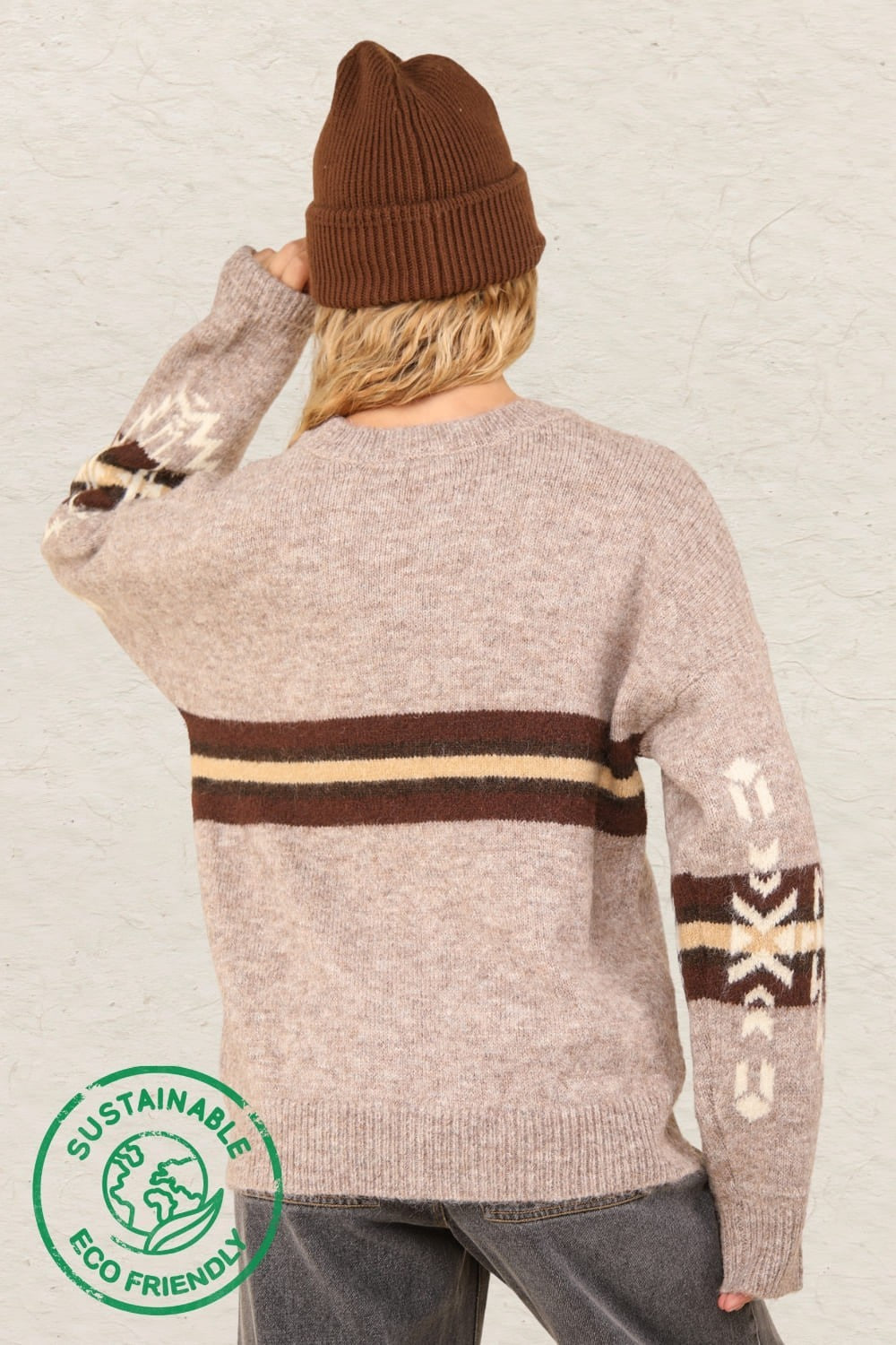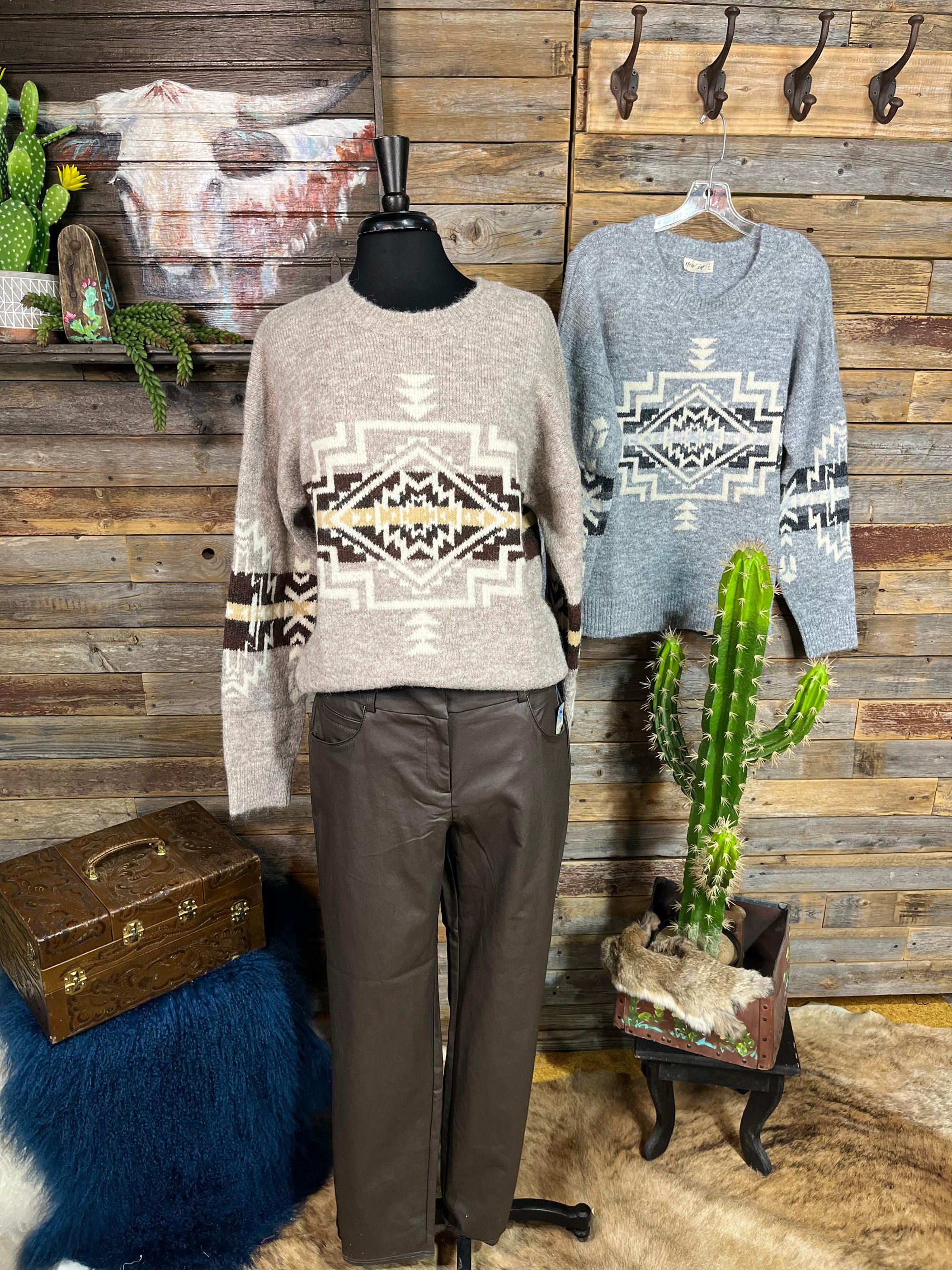 This Aztec Graphic Printed Cozy Knit Sweater Top features a round neck, oversized fit, drop shoulder, and long sleeves. Made from 59% recycled polyester, 21% nylon, 11% polyester, 8% wool, and 1% spandex for a comfortable and eco-friendly option.