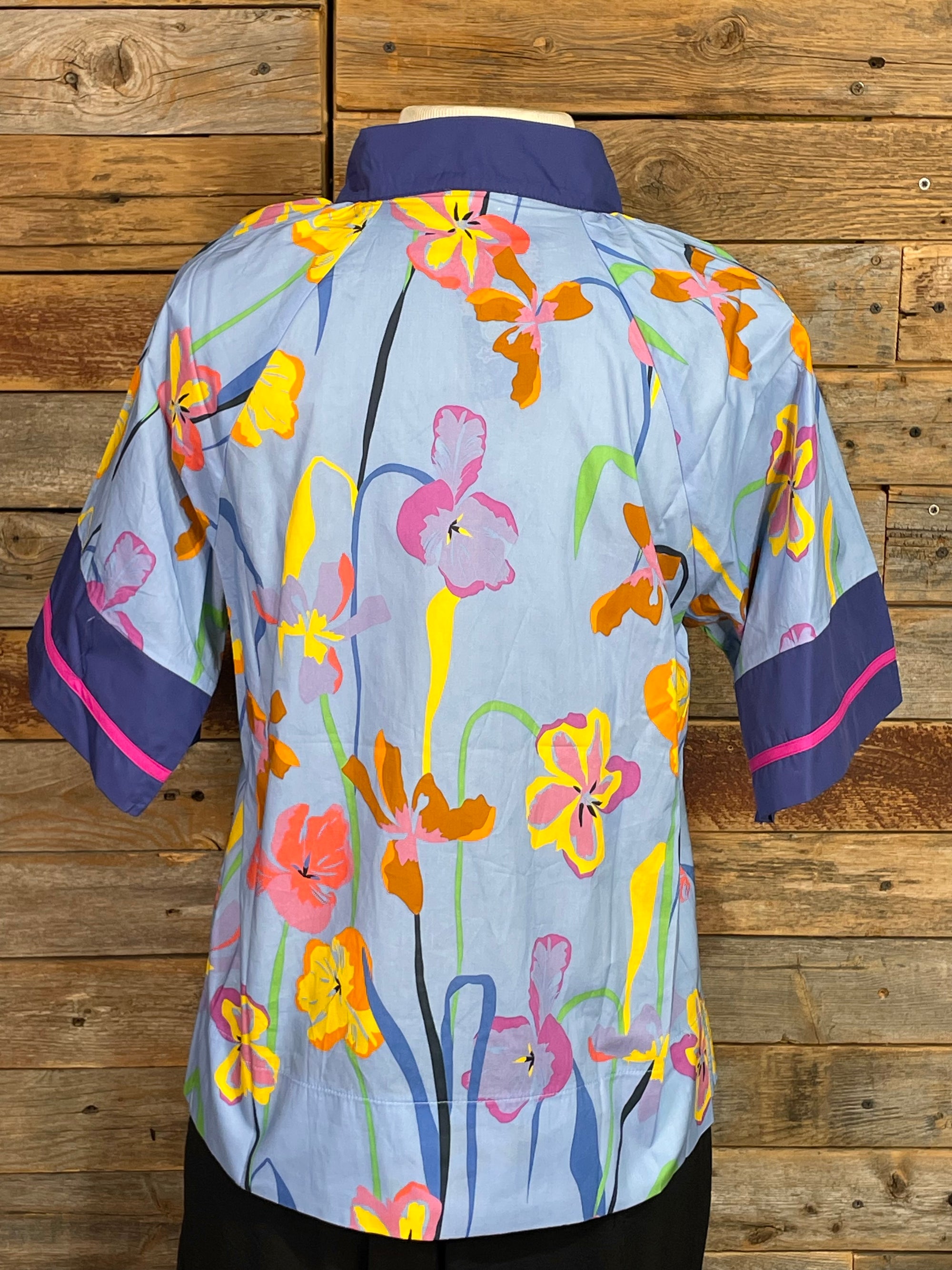 Flirt with florals in this charming rayon top featuring a flattering V-neckline and mock collar. Vibrant fuchsia stripes pop at the collar and sleeves, while an all-over multicolor floral print keeps things fresh and fun. Practical side slits add movement and comfort to your everyday style.